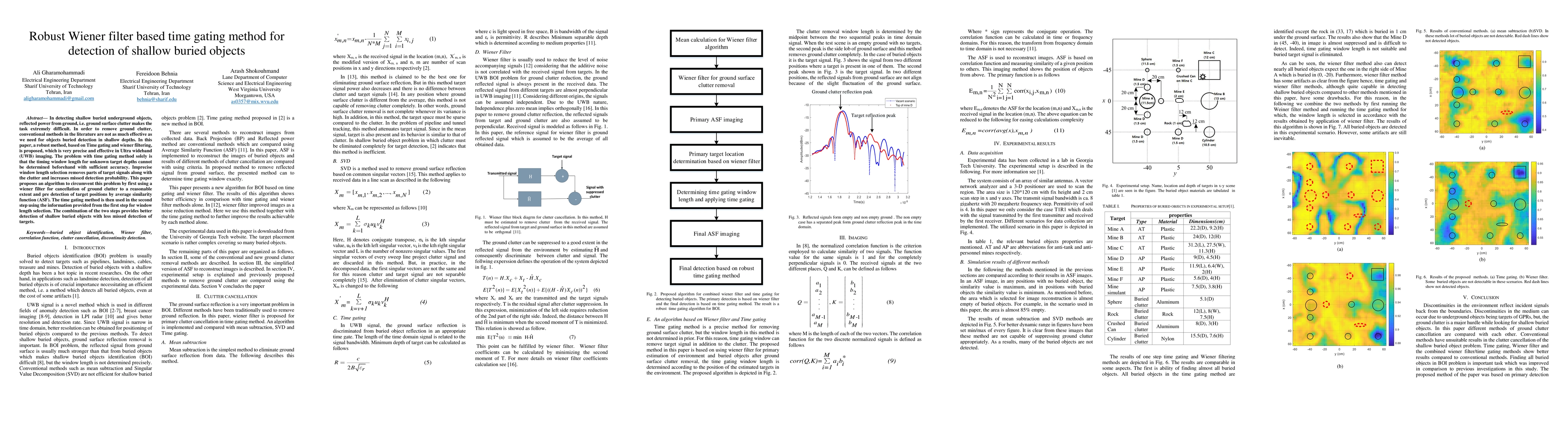 In detecting shallow buried underground objects, reflected power from ground, i.e. ground surface clutter makes the task extremely difficult. In order to remove ground clutter, conventional methods in the literature are not as much effective as we need for objects buried detection in shallow depths. In this paper, a robust method, based on Time gating and wiener filtering, is proposed, which is very precise and effective in Ultra wideband (UWB) imaging. The problem with time gating method solely is that the timing window length for unknown target depths cannot be determined beforehand with sufficient accuracy. Imprecise window length selection removes parts of target signals along with the clutter and increases missed detection probability. This paper proposes an algorithm to circumvent this problem by first using a wiener filter for cancellation of ground clutter to a reasonable extent and pre detection of target positions by average similarity function (ASF). The time gating method is then used in the second step using the information provided from the first step for window length selection. The combination of the two steps provides better detection of shallow buried objects with less missed detection of targets.