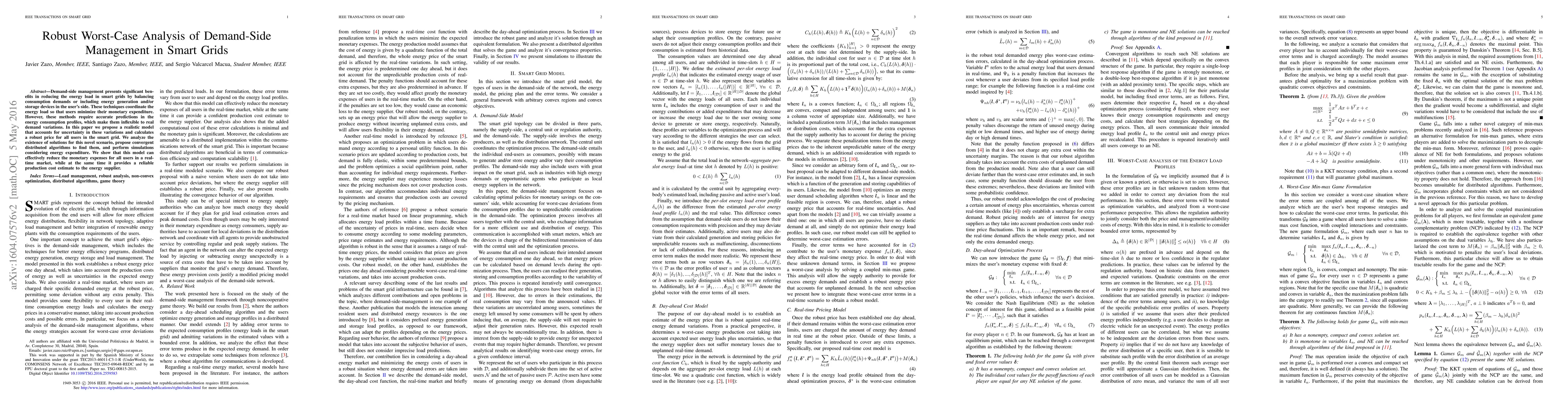 This paper proposes a robust model for demand-side management in smart grids that accounts for uncertainties in energy consumption profiles, enabling effective real-time cost reduction for users while providing reliable production cost estimates for energy suppliers. The study introduces distributed algorithms to find solutions and demonstrates their effectiveness through simulations.