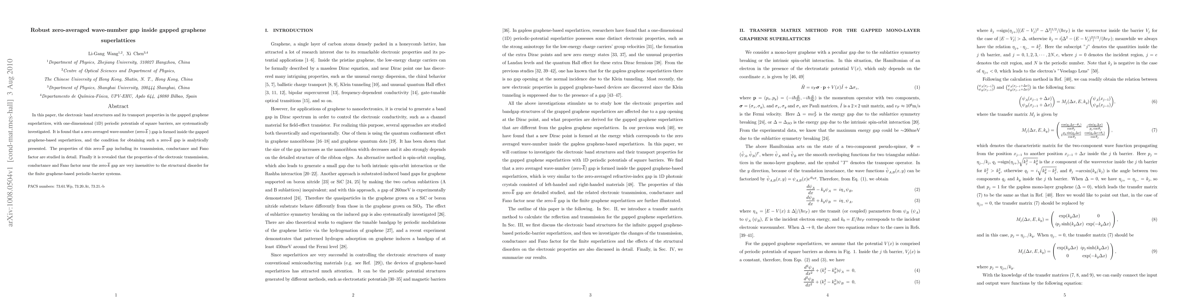 In this paper, the electronic band structures and its transport properties in the gapped graphene superlattices, with one-dimensional (1D) periodic potentials of square barriers, are systematically investigated. It is found that a zero averaged wave-number (zero-$\overline{k}$ ) gap is formed inside the gapped graphene-based superlattices, and the condition for obtaining such a zero-$\overline{k}$ gap is analytically presented. The properties of this zero-$\overline{k}$ gap including its transmission, conductance and Fano factor are studied in detail. Finally it is revealed that the properties of the electronic transmission, conductance and Fano factor near the zero-$\overline{k}$ gap are very insensitive to the structural disorder for the finite graphene-based periodic-barrier systems.
