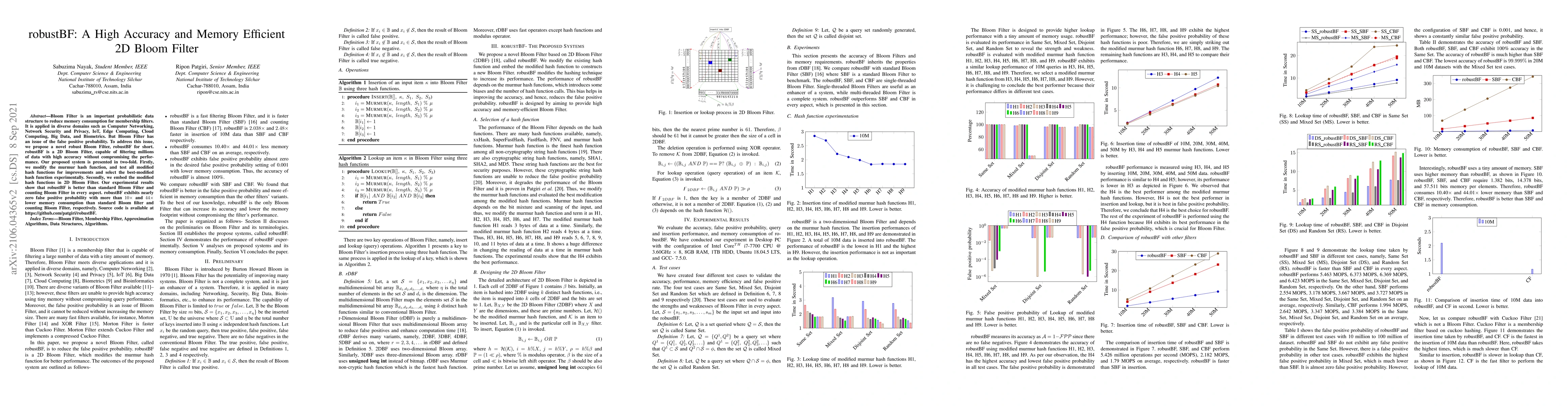 The paper introduces robustBF, an advanced 2D Bloom Filter that minimizes false positives and drastically reduces memory usage while maintaining high accuracy, by employing optimized murmur hash functions. Experimental results demonstrate robustBF outperforms standard and counting Bloom Filters with significantly lower false positive rates and memory consumption.