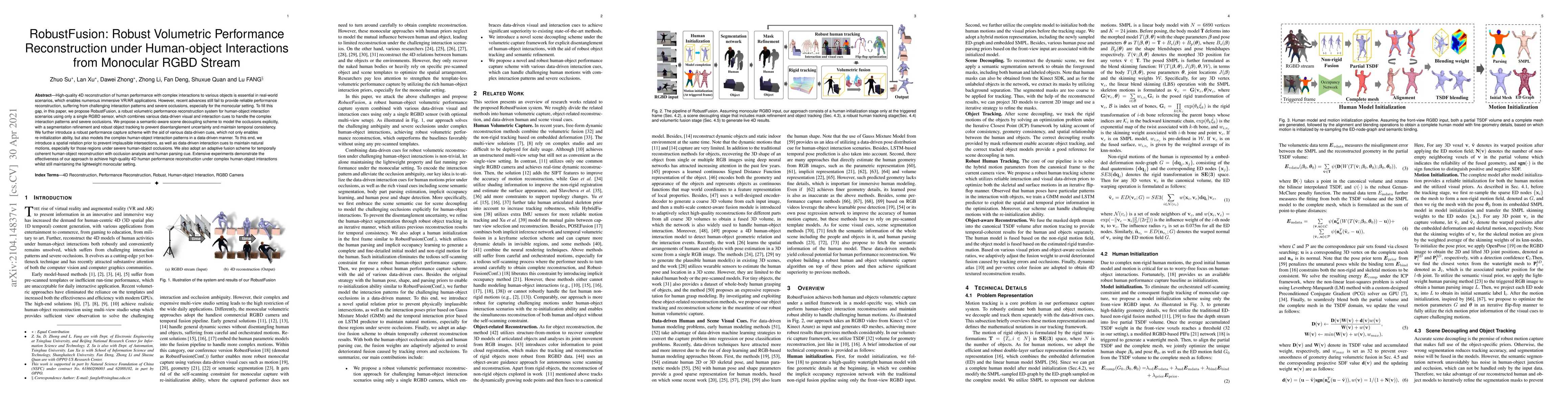 RobustFusion proposes a system for high-quality 4D volumetric reconstruction of human performance during complex interactions with objects using a single RGBD sensor, addressing challenges like occlusions and interaction patterns through semantic-aware scene decoupling and robust performance capture. The method achieves temporal consistency and natural motion modeling via adaptive fusion and spatial relation priors.