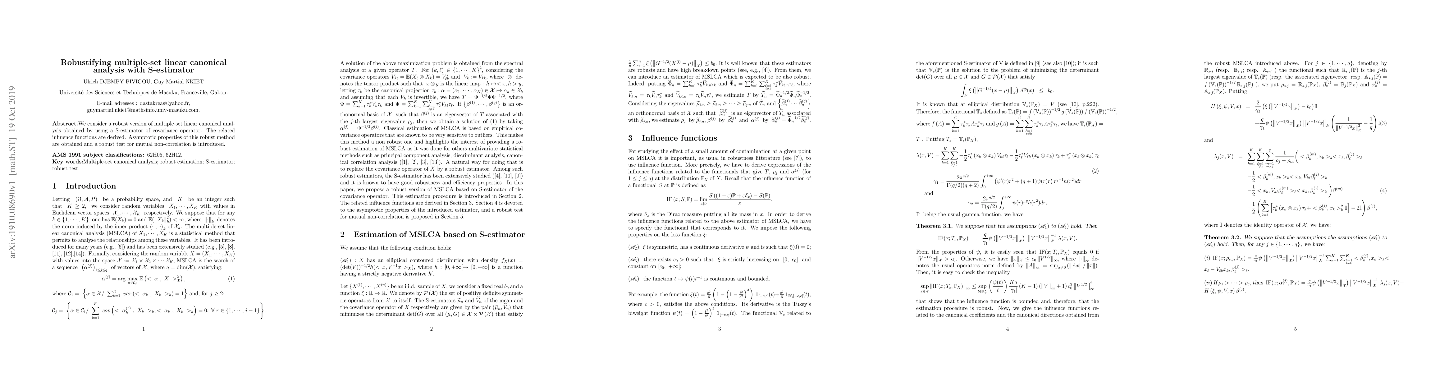 This paper proposes a robust version of multiple-set linear canonical analysis using an S-estimator of the covariance operator, derives its influence functions, and establishes asymptotic properties. It also introduces a robust test for mutual non-correlation.