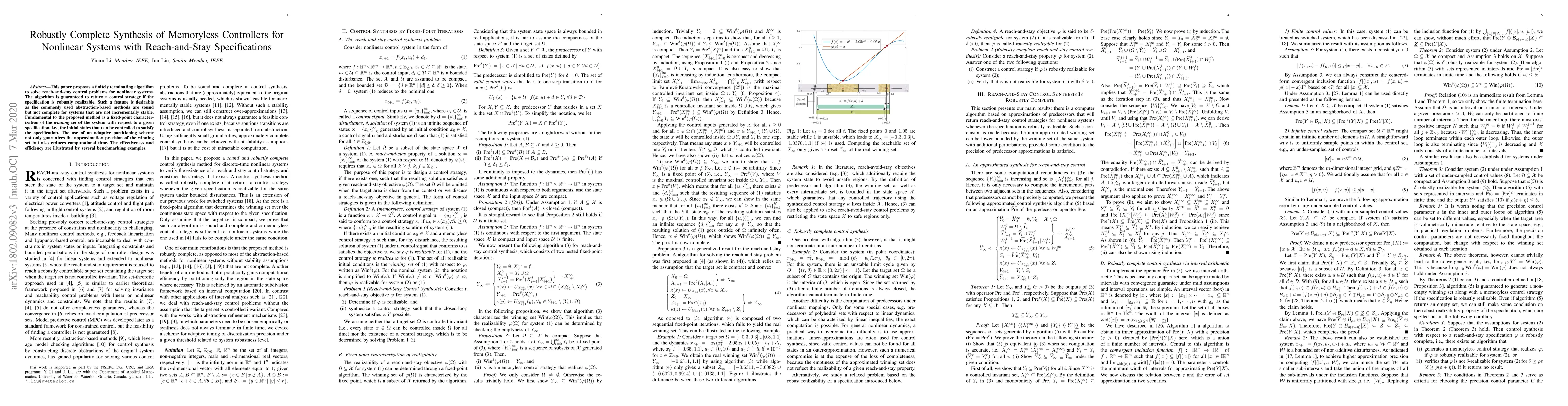 This paper proposes a finitely terminating algorithm to solve reach-and-stay control problems for nonlinear systems. The algorithm is guaranteed to return a control strategy if the specification is robustly realizable. Such a feature is desirable as the commonly used abstraction-based methods are sound but not complete for systems that are not incrementally stable. Fundamental to the proposed method is a fixed-point characterization of the winning set of the system with respect to a given specification, i.e., the initial states that can be controlled to satisfy the specification. The use of an adaptive partitioning scheme not only guarantees the approximation precision of the winning set but also reduces computational time. The effectiveness and efficiency are illustrated by several benchmarking examples.