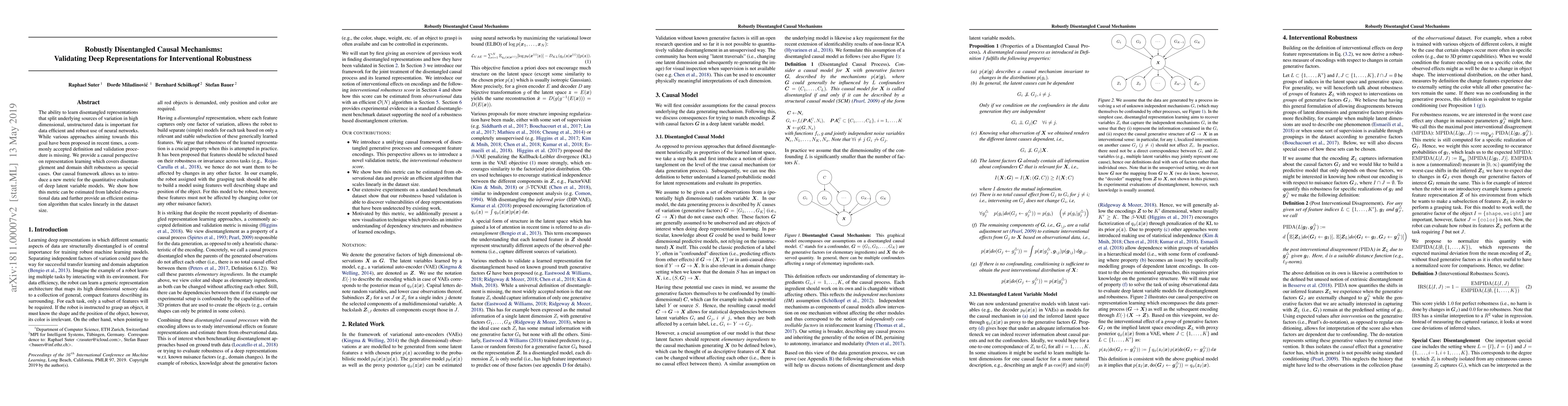 The ability to learn disentangled representations that split underlying sources of variation in high dimensional, unstructured data is important for data efficient and robust use of neural networks. While various approaches aiming towards this goal have been proposed in recent times, a commonly accepted definition and validation procedure is missing. We provide a causal perspective on representation learning which covers disentanglement and domain shift robustness as special cases. Our causal framework allows us to introduce a new metric for the quantitative evaluation of deep latent variable models. We show how this metric can be estimated from labeled observational data and further provide an efficient estimation algorithm that scales linearly in the dataset size.