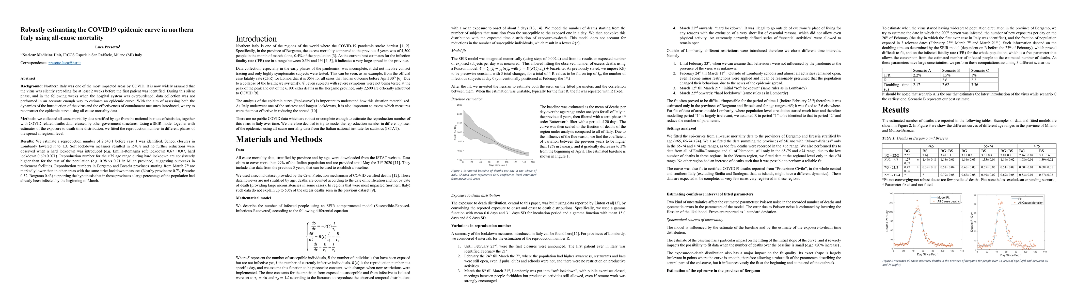 Background: Northern Italy was one of the most impacted areas by COVID. It is now widely assumed that the virus was silently spreading for at least 2 weeks before the first patient was identified. During this silent phase, and in the following weeks when the hospital system was overburdened, data collection was not performed in an accurate enough way to estimate an epidemic curve. With the aim of assessing both the dynamics of the introduction of the virus and the effectiveness of containment measures introduced, we try to reconstruct the epidemic curve using all cause mortality data. Methods: we collected all cause mortality data stratified by age from the national institute of statistics, together with COVID-related deaths data released by other government structures. Using a SEIR model together with estimates of the exposure to death time distribution, we fitted the reproduction number in different phases of the spread at regional level. Results: We estimate a reproduction number of 2.6+/-0.1 before case 1 was identified. School closures in Lombardy lowered it to 1.3. Soft lockdown measures resulted in R<0.8 and no further reductions were observed when a hard lockdown was introduced (e.g. Emilia-Romagna soft lockdown 0.67 +/-0.07, hard lockdown 0.69+/-0.071). Reproduction number for the >75 age range during hard lockdown are consistently higher than for the rest of the population (e.g. 0.98 vs 0.71 in Milan province), suggesting outbreaks in retirement facilities. Reproduction numbers in Bergamo and Brescia provinces starting from March 7th are markedly lower than in other areas with the same strict lockdown measures (Nearby provinces: 0.73, Brescia: 0.52, Bergamo 0.43) supporting the hypothesis that in those provinces a large percentage of the population had already been infected by the beginning of March.