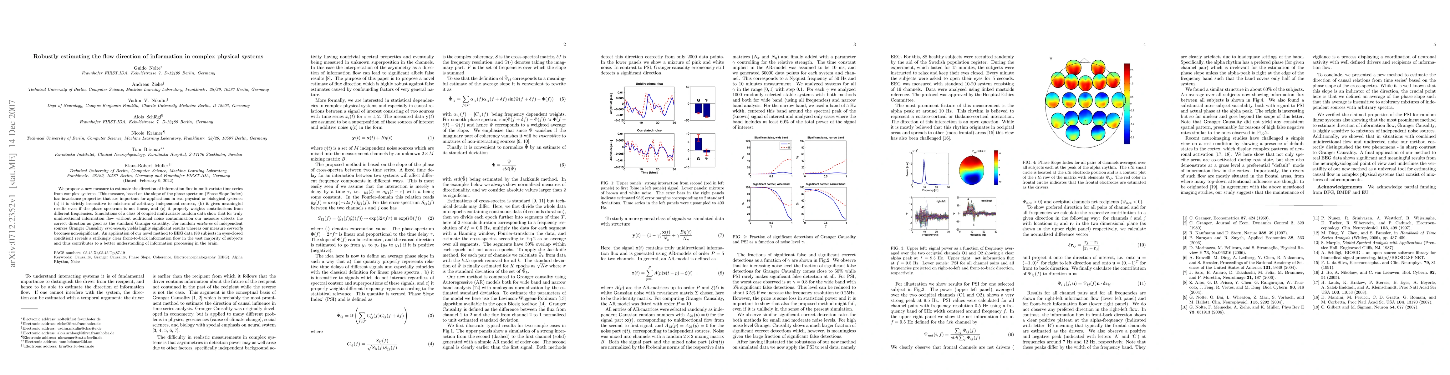 We propose a new measure to estimate the direction of information flux in multivariate time series from complex systems. This measure, based on the slope of the phase spectrum (Phase Slope Index) has invariance properties that are important for applications in real physical or biological systems: (a) it is strictly insensitive to mixtures of arbitrary independent sources, (b) it gives meaningful results even if the phase spectrum is not linear, and (c) it properly weights contributions from different frequencies. Simulations of a class of coupled multivariate random data show that for truly unidirectional information flow without additional noise contamination our measure detects the correct direction as good as the standard Granger causality. For random mixtures of independent sources Granger Causality erroneously yields highly significant results whereas our measure correctly becomes non-significant. An application of our novel method to EEG data (88 subjects in eyes-closed condition) reveals a strikingly clear front-to-back information flow in the vast majority of subjects and thus contributes to a better understanding of information processing in the brain.