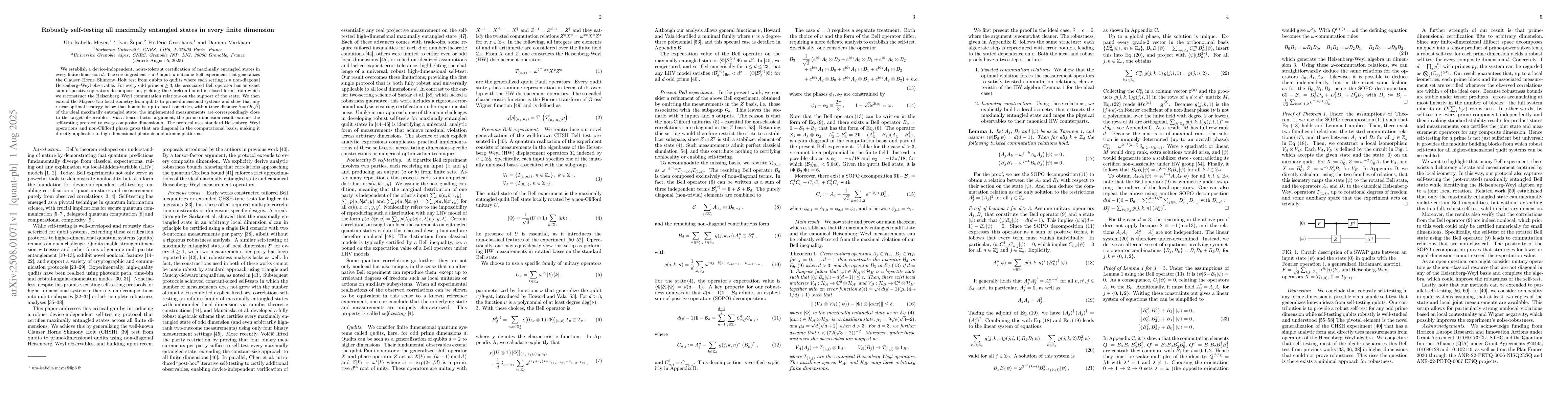 The research establishes a device-independent, noise-tolerant certification of maximally entangled states in every finite dimension d using a d-input, d-outcome Bell experiment that generalizes the Clauser-Horne-Shimony-Holt test from qubits to qudits.