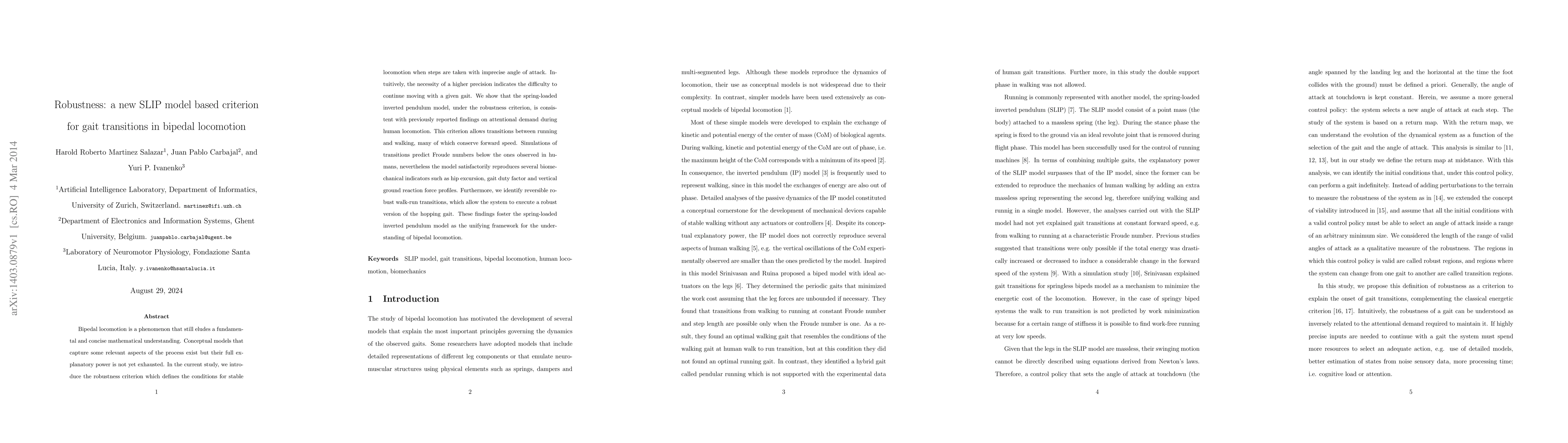 Bipedal locomotion is a phenomenon that still eludes a fundamental and concise mathematical understanding. Conceptual models that capture some relevant aspects of the process exist but their full explanatory power is not yet exhausted. In the current study, we introduce the robustness criterion which defines the conditions for stable locomotion when steps are taken with imprecise angle of attack. Intuitively, the necessity of a higher precision indicates the difficulty to continue moving with a given gait. We show that the spring-loaded inverted pendulum model, under the robustness criterion, is consistent with previously reported findings on attentional demand during human locomotion. This criterion allows transitions between running and walking, many of which conserve forward speed. Simulations of transitions predict Froude numbers below the ones observed in humans, nevertheless the model satisfactorily reproduces several biomechanical indicators such as hip excursion, gait duty factor and vertical ground reaction force profiles. Furthermore, we identify reversible robust walk-run transitions, which allow the system to execute a robust version of the hopping gait. These findings foster the spring-loaded inverted pendulum model as the unifying framework for the understanding of bipedal locomotion.