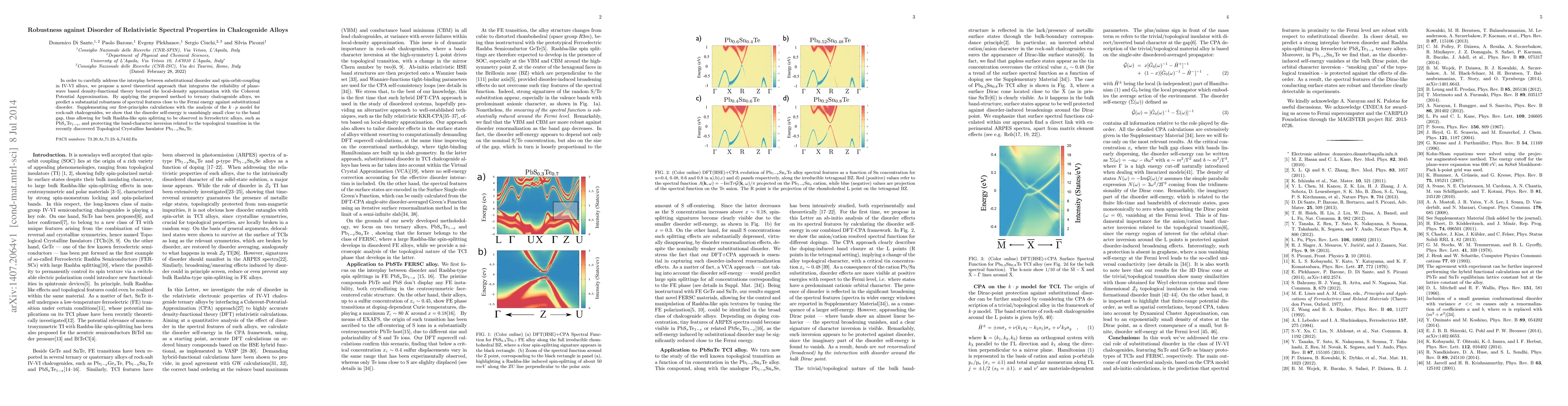 In order to carefully address the interplay between substitutional disorder and spin-orbit-coupling in IV-VI alloys, we propose a novel theoretical approach that integrates the reliability of plane-wave based density-functional theory beyond the local-density approximation with the Coherent Potential Approximation. By applying the proposed method to ternary chalcogenide alloys, we predict a substantial robustness of spectral features close to the Fermi energy against substitutional disorder. Supplementing our first-principles calculations with the analysis of the $k \cdot p$ model for rock-salt chalcogenides, we show that the disorder self-energy is vanishingly small close to the band gap, thus allowing for bulk Rashba-like spin splitting to be observed in ferroelectric alloys, such as PbS$_x$Te$_{1-x}$, and protecting the band-character inversion related to the topological transition in the recently discovered Topological Crystalline Insulator Pb$_{1-x}$Sn$_x$Te.