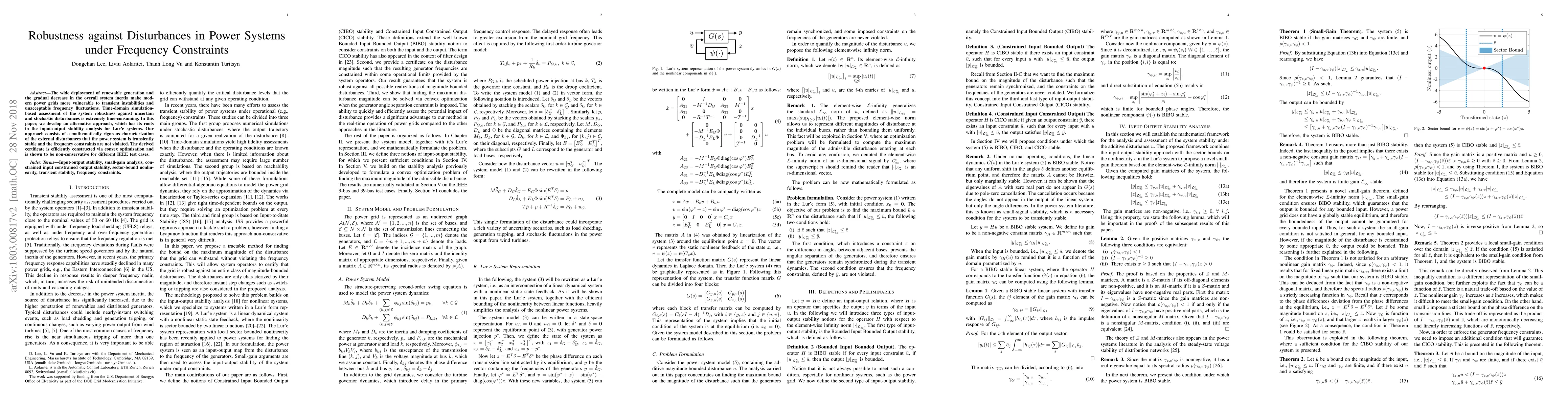 The wide deployment of renewable generation and the gradual decrease in the overall system inertia make modern power grids more vulnerable to transient instabilities and unacceptable frequency fluctuations. Time-domain simulation-based assessment of the system robustness against uncertain and stochastic disturbances is extremely time-consuming. In this paper, we develop an alternative approach, which has its roots in the input-output stability analysis for Lur'e systems. Our approach consists of a mathematically rigorous characterization of the external disturbances that the power system is transiently stable and the frequency constraints are not violated. The derived certificate is efficiently constructed via convex optimization and is shown to be non-conservative for different IEEE test cases.
