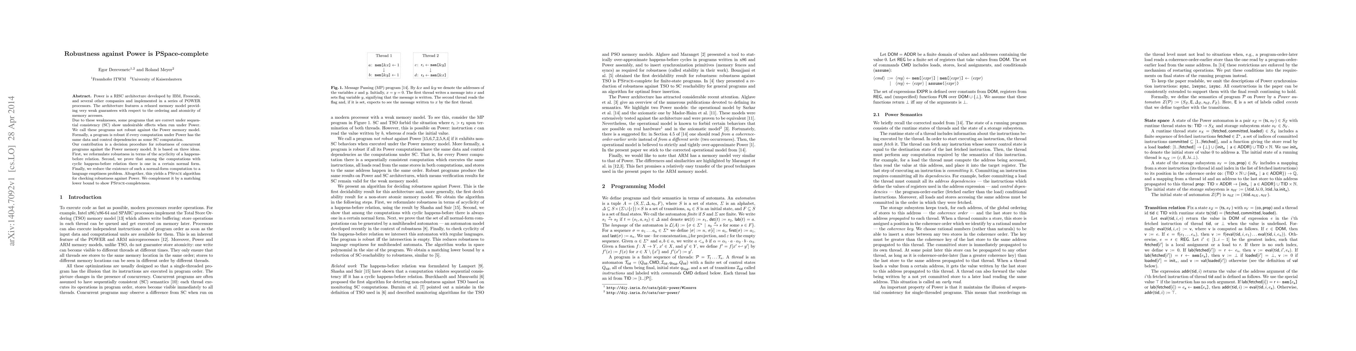 This paper presents a decision procedure for determining the robustness of concurrent programs against the Power memory model, showing that the problem is PSPACE-complete. The authors reformulate robustness in terms of acyclicity and reduce it to a language emptiness problem, yielding a PSPACE algorithm and proving PSPACE-completeness.