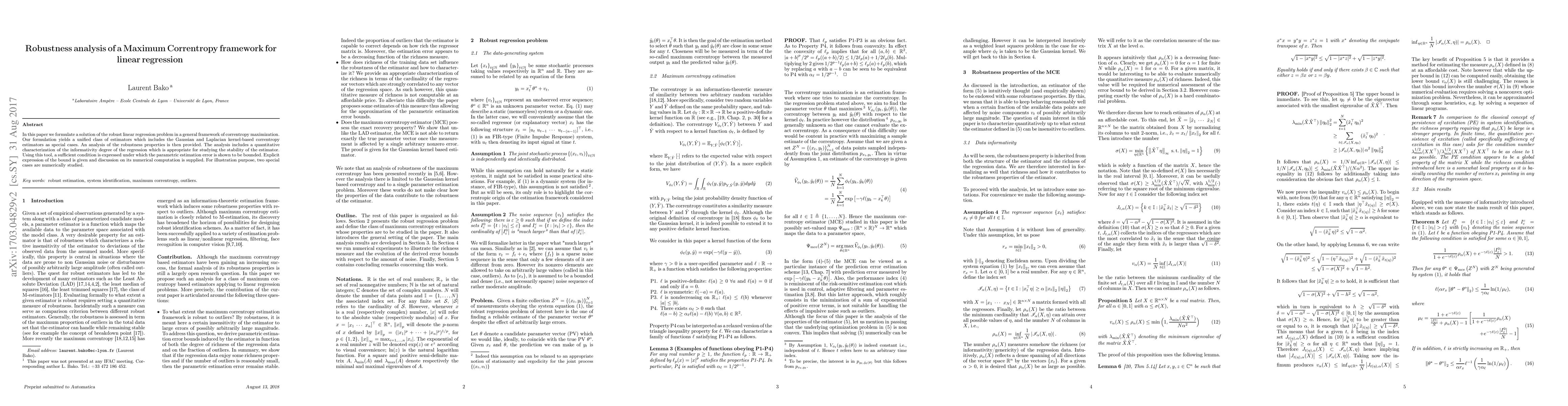 This paper proposes a robust linear regression solution based on maximum correntropy, yielding a unified class of estimators including Gaussian and Laplacian kernels. It analyzes robustness, providing a quantitative informativity degree, and derives a sufficient condition for bounded parametric estimation error with an explicit bound.
