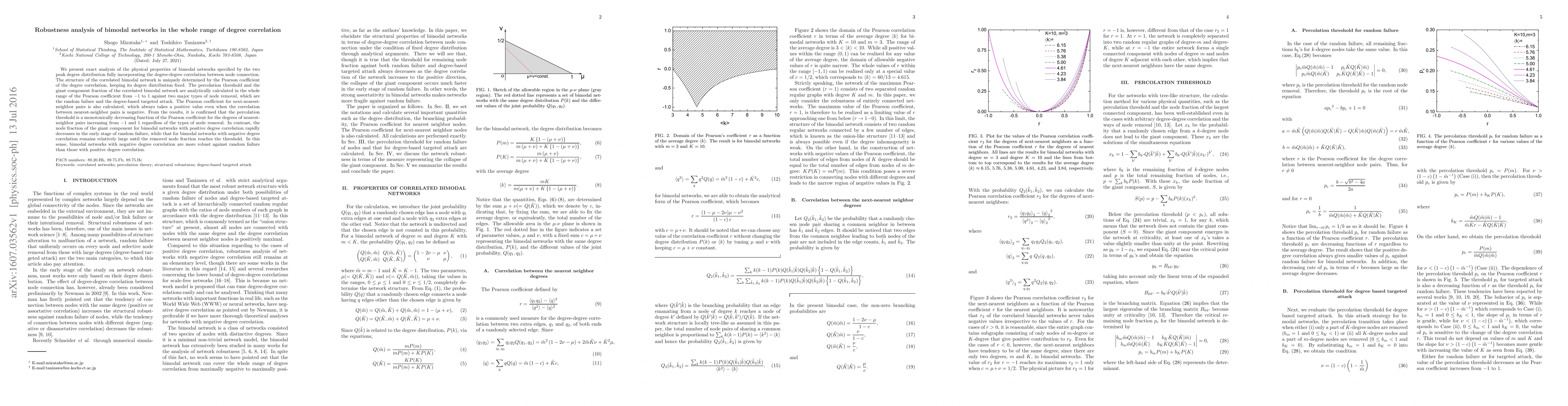 This paper provides an exact analysis of bimodal networks' physical properties, focusing on the degree-degree correlation's impact on network robustness. It finds that bimodal networks with negative degree correlation are more resilient to random failures compared to those with positive correlation.