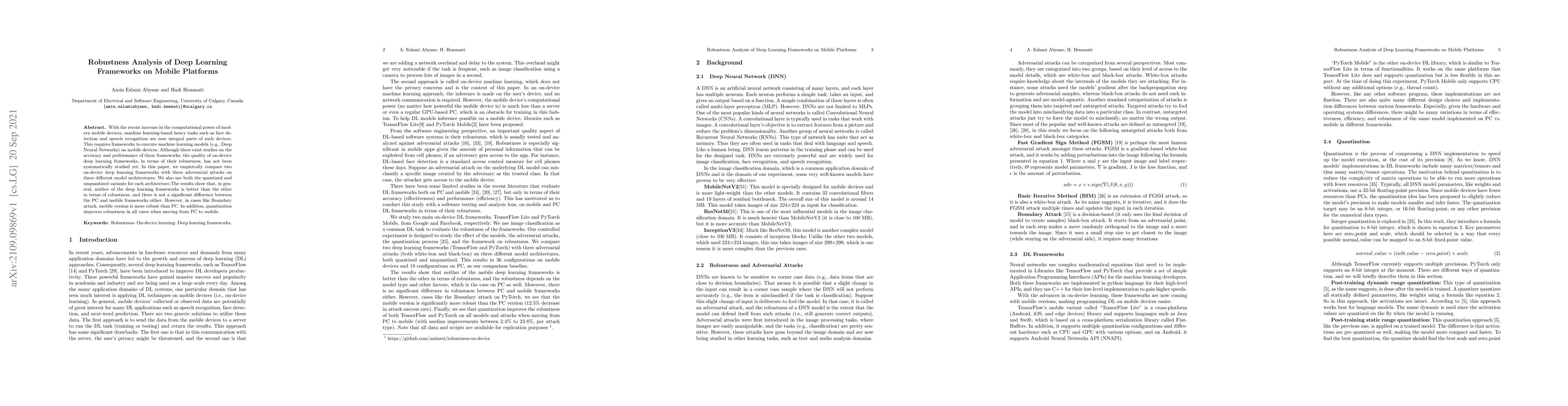 With the recent increase in the computational power of modern mobile devices, machine learning-based heavy tasks such as face detection and speech recognition are now integral parts of such devices. This requires frameworks to execute machine learning models (e.g., Deep Neural Networks) on mobile devices. Although there exist studies on the accuracy and performance of these frameworks, the quality of on-device deep learning frameworks, in terms of their robustness, has not been systematically studied yet. In this paper, we empirically compare two on-device deep learning frameworks with three adversarial attacks on three different model architectures. We also use both the quantized and unquantized variants for each architecture. The results show that, in general, neither of the deep learning frameworks is better than the other in terms of robustness, and there is not a significant difference between the PC and mobile frameworks either. However, in cases like Boundary attack, mobile version is more robust than PC. In addition, quantization improves robustness in all cases when moving from PC to mobile.