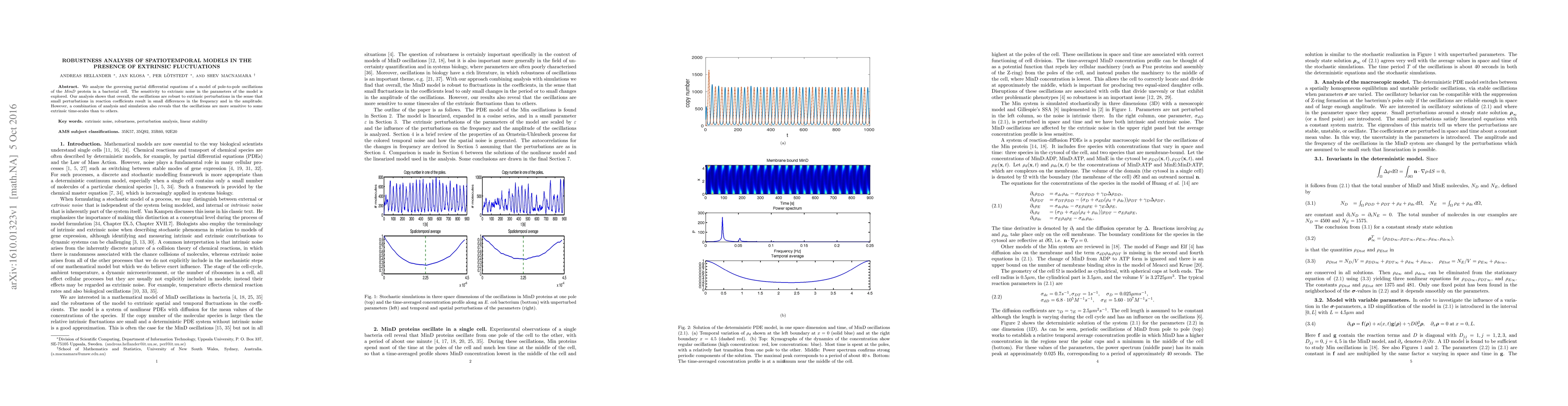 We analyze the governing partial differential equations of a model of pole-to-pole oscillations of the MinD protein in a bacterial cell. The sensitivity to extrinsic noise in the parameters of the model is explored. Our analysis shows that overall, the oscillations are robust to extrinsic perturbations in the sense that small perturbations in reaction coefficients result in small differences in the frequency and in the amplitude. However, a combination of analysis and simulation also reveals that the oscillations are more sensitive to some extrinsic time-scales than to others.