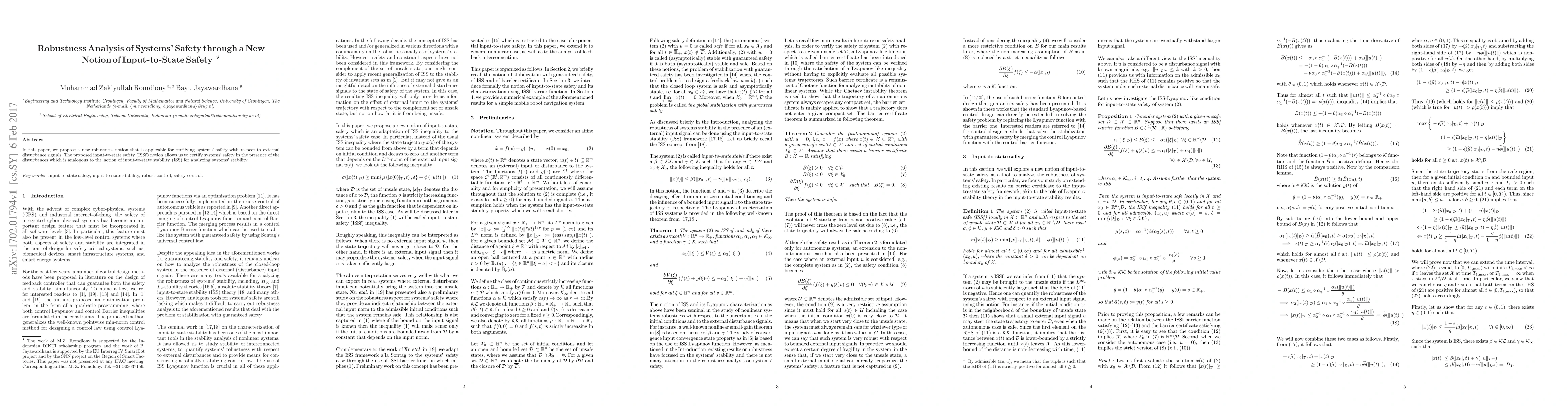 This paper introduces a new robustness concept called input-to-state safety (ISSf) to certify systems' safety against external disturbances, analogous to input-to-state stability (ISS) for stability analysis. The ISSf notion enables safety certification in the presence of disturbances.