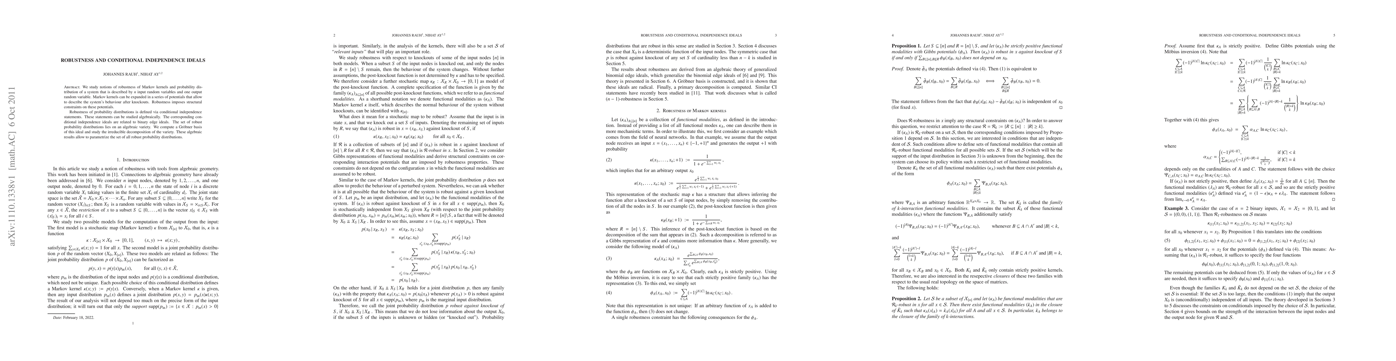 We study notions of robustness of Markov kernels and probability distribution of a system that is described by $n$ input random variables and one output random variable. Markov kernels can be expanded in a series of potentials that allow to describe the system's behaviour after knockouts. Robustness imposes structural constraints on these potentials. Robustness of probability distributions is defined via conditional independence statements. These statements can be studied algebraically. The corresponding conditional independence ideals are related to binary edge ideals. The set of robust probability distributions lies on an algebraic variety. We compute a Gr\"obner basis of this ideal and study the irreducible decomposition of the variety. These algebraic results allow to parametrize the set of all robust probability distributions.