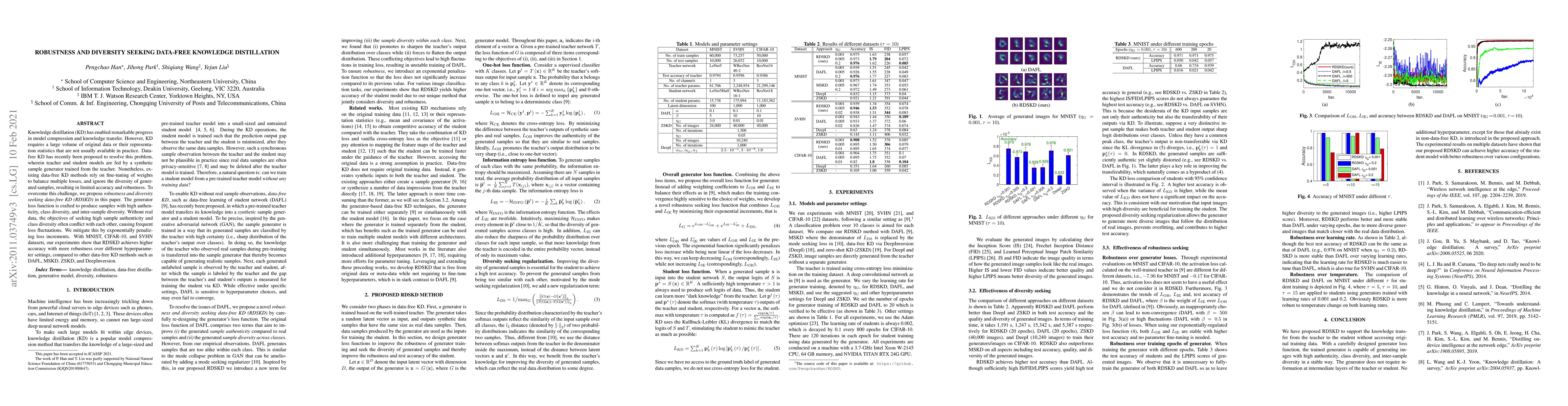This paper proposes a robustness and diversity seeking data-free knowledge distillation method (RDSKD) to enhance model compression without requiring original data. It addresses the conflict between sample authenticity and class diversity by penalizing loss increments, achieving higher accuracy and robustness compared to other data-free methods.
