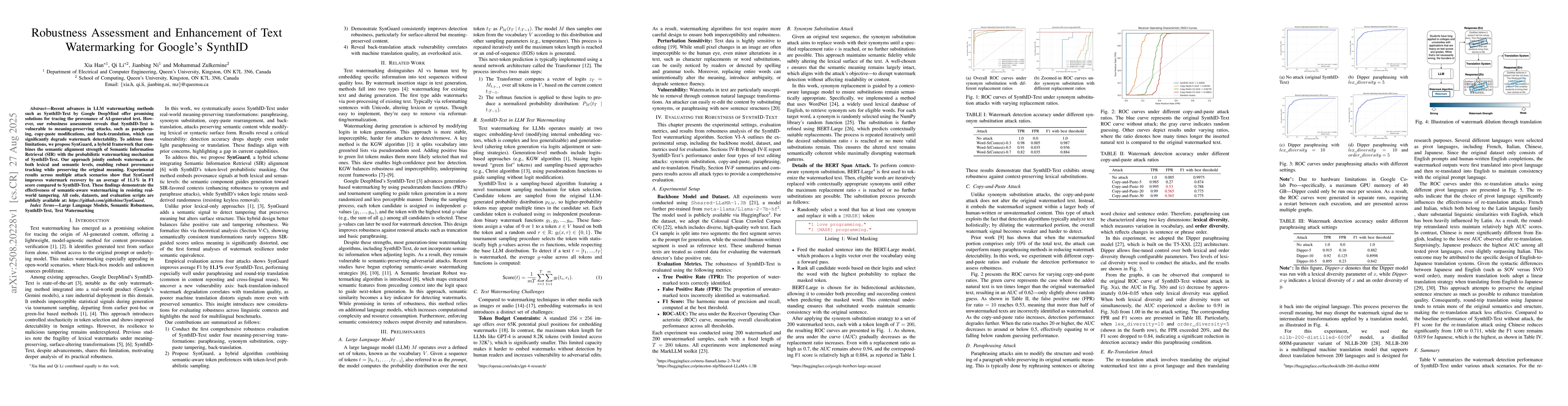 Recent advances in LLM watermarking methods such as SynthID-Text by Google DeepMind offer promising solutions for tracing the provenance of AI-generated text. However, our robustness assessment reveals that SynthID-Text is vulnerable to meaning-preserving attacks, such as paraphrasing, copy-paste modifications, and back-translation, which can significantly degrade watermark detectability. To address these limitations, we propose SynGuard, a hybrid framework that combines the semantic alignment strength of Semantic Information Retrieval (SIR) with the probabilistic watermarking mechanism of SynthID-Text. Our approach jointly embeds watermarks at both lexical and semantic levels, enabling robust provenance tracking while preserving the original meaning. Experimental results across multiple attack scenarios show that SynGuard improves watermark recovery by an average of 11.1\% in F1 score compared to SynthID-Text. These findings demonstrate the effectiveness of semantic-aware watermarking in resisting real-world tampering. All code, datasets, and evaluation scripts are publicly available at: https://github.com/githshine/SynGuard.