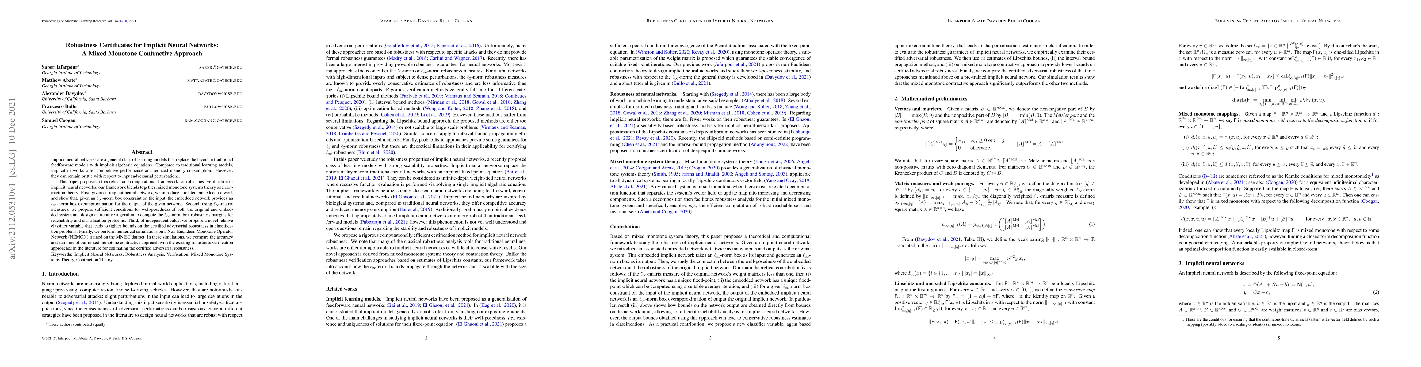 Implicit neural networks are a general class of learning models that replace the layers in traditional feedforward models with implicit algebraic equations. Compared to traditional learning models, implicit networks offer competitive performance and reduced memory consumption. However, they can remain brittle with respect to input adversarial perturbations. This paper proposes a theoretical and computational framework for robustness verification of implicit neural networks; our framework blends together mixed monotone systems theory and contraction theory. First, given an implicit neural network, we introduce a related embedded network and show that, given an $\ell_\infty$-norm box constraint on the input, the embedded network provides an $\ell_\infty$-norm box overapproximation for the output of the given network. Second, using $\ell_{\infty}$-matrix measures, we propose sufficient conditions for well-posedness of both the original and embedded system and design an iterative algorithm to compute the $\ell_{\infty}$-norm box robustness margins for reachability and classification problems. Third, of independent value, we propose a novel relative classifier variable that leads to tighter bounds on the certified adversarial robustness in classification problems. Finally, we perform numerical simulations on a Non-Euclidean Monotone Operator Network (NEMON) trained on the MNIST dataset. In these simulations, we compare the accuracy and run time of our mixed monotone contractive approach with the existing robustness verification approaches in the literature for estimating the certified adversarial robustness.
