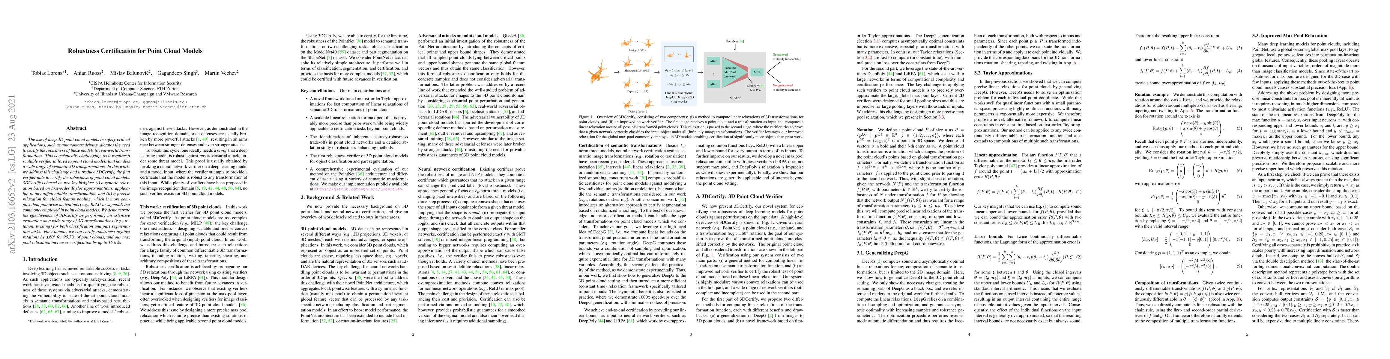 A new verifier called 3DCertify has been introduced to certify the robustness of point cloud models in safety-critical applications like autonomous driving. It demonstrates effectiveness against various transformations and increases certification by up to 15.6%.