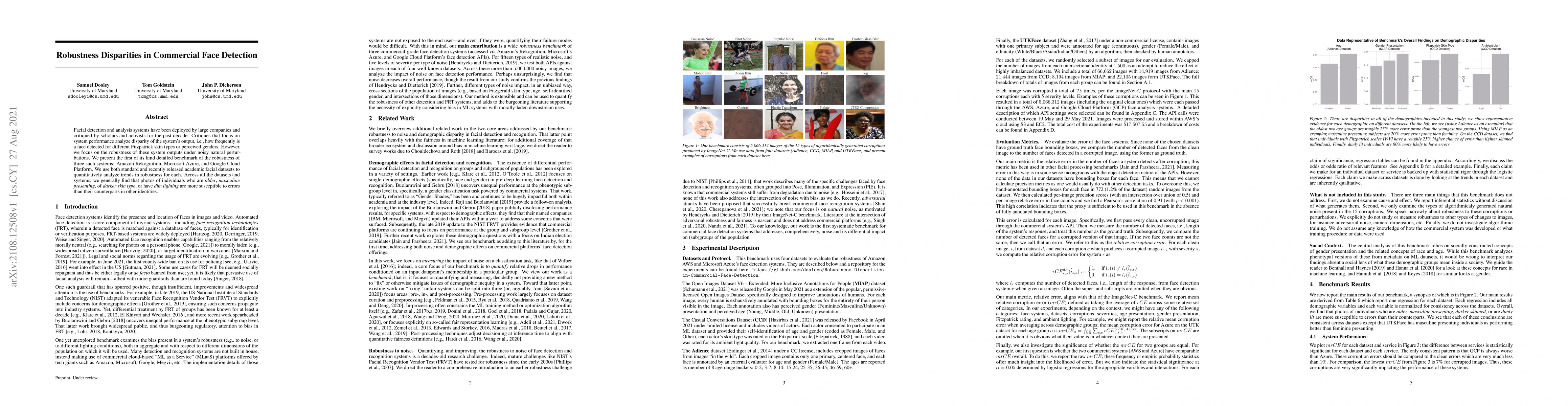 Facial detection and analysis systems have been deployed by large companies and critiqued by scholars and activists for the past decade. Critiques that focus on system performance analyze disparity of the system's output, i.e., how frequently is a face detected for different Fitzpatrick skin types or perceived genders. However, we focus on the robustness of these system outputs under noisy natural perturbations. We present the first of its kind detailed benchmark of the robustness of three such systems: Amazon Rekognition, Microsoft Azure, and Google Cloud Platform. We use both standard and recently released academic facial datasets to quantitatively analyze trends in robustness for each. Across all the datasets and systems, we generally find that photos of individuals who are older, masculine presenting, of darker skin type, or have dim lighting are more susceptible to errors than their counterparts in other identities.