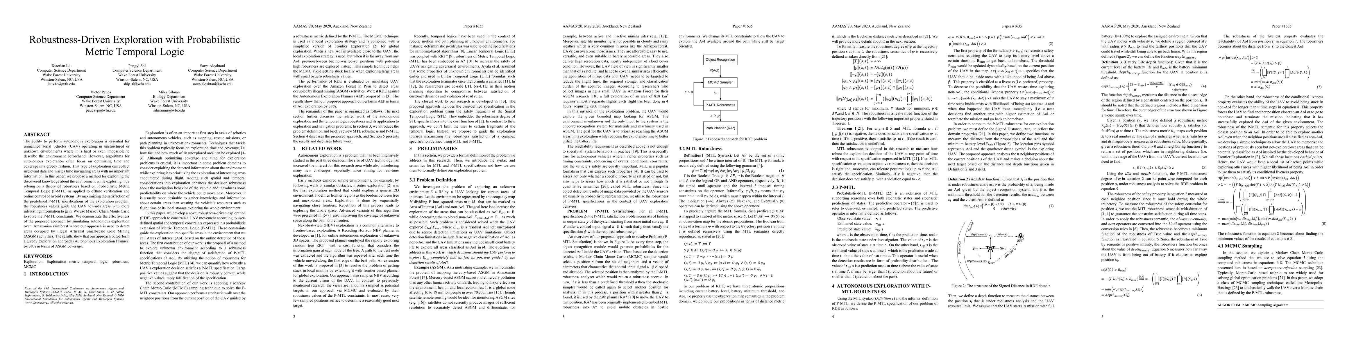 The ability to perform autonomous exploration is essential for unmanned aerial vehicles (UAV) operating in unstructured or unknown environments where it is hard or even impossible to describe the environment beforehand. However, algorithms for autonomous exploration often focus on optimizing time and coverage in a greedy fashion. That type of exploration can collect irrelevant data and wastes time navigating areas with no important information. In this paper, we propose a method for exploiting the discovered knowledge about the environment while exploring it by relying on a theory of robustness based on Probabilistic Metric Temporal Logic (P-MTL) as applied to offline verification and online control of hybrid systems. By maximizing the satisfaction of the predefined P-MTL specifications of the exploration problem, the robustness values guide the UAV towards areas with more interesting information to gain. We use Markov Chain Monte Carlo to solve the P-MTL constraints. We demonstrate the effectiveness of the proposed approach by simulating autonomous exploration over Amazonian rainforest where our approach is used to detect areas occupied by illegal Artisanal Small-scale Gold Mining (ASGM) activities. The results show that our approach outperform a greedy exploration approach (Autonomous Exploration Planner) by 38% in terms of ASGM coverage.