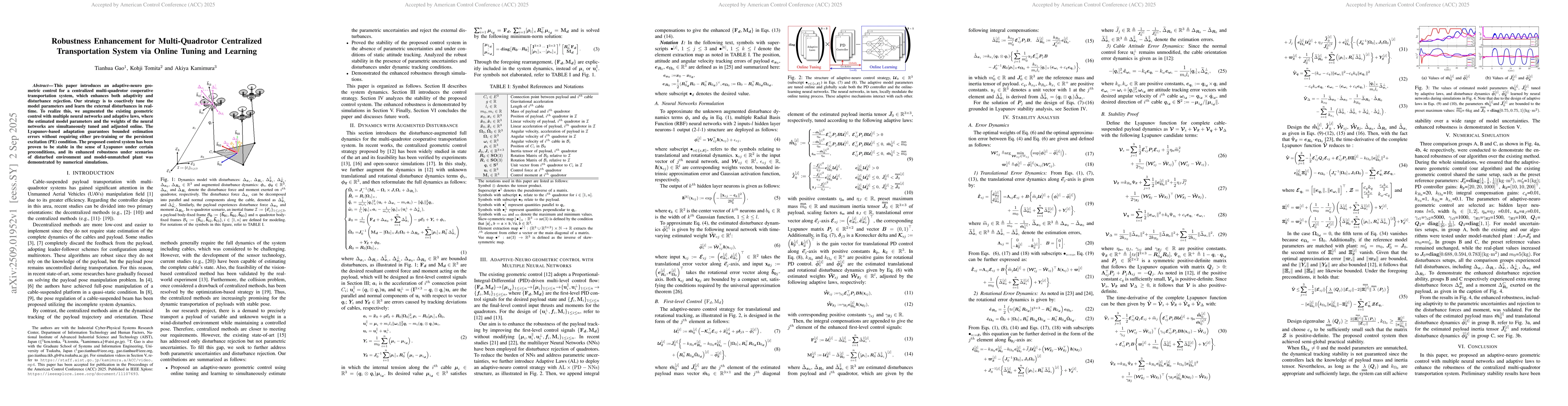 This paper introduces an adaptive-neuro geometric control for a centralized multi-quadrotor cooperative transportation system, which enhances both adaptivity and disturbance rejection. Our strategy is to coactively tune the model parameters and learn the external disturbances in real-time. To realize this, we augmented the existing geometric control with multiple neural networks and adaptive laws, where the estimated model parameters and the weights of the neural networks are simultaneously tuned and adjusted online. The Lyapunov-based adaptation guarantees bounded estimation errors without requiring either pre-training or the persistent excitation (PE) condition. The proposed control system has been proven to be stable in the sense of Lyapunov under certain preconditions, and its enhanced robustness under scenarios of disturbed environment and model-unmatched plant was demonstrated by numerical simulations.
