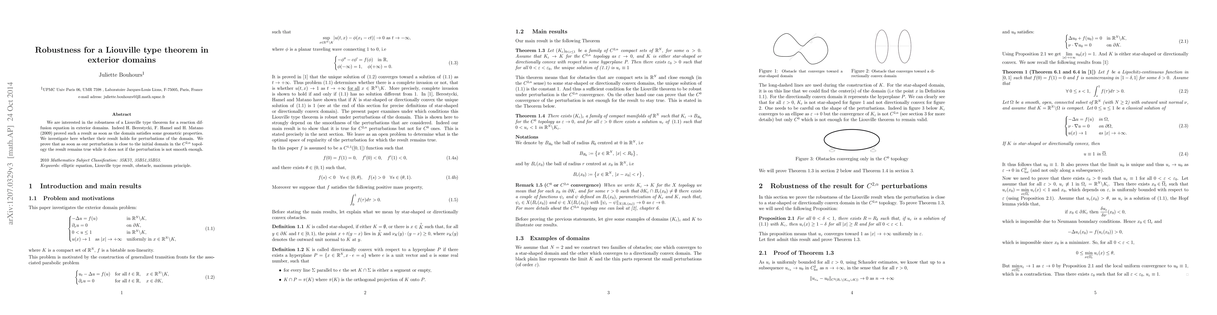 We are interested in the robustness of a Liouville type theorem for a reaction diffusion equation in exterior domains. Indeed H. Berestycki, F. Hamel and H. Matano (2009) proved such a result as soon as the domain satisfies some geometric properties. We investigate here whether their result holds for perturbations of the domain. We prove that as soon as our perturbation is close to the initial domain in the $C^{2,\alpha}$ topology the result remains true while it does not if the perturbation is not smooth enough.