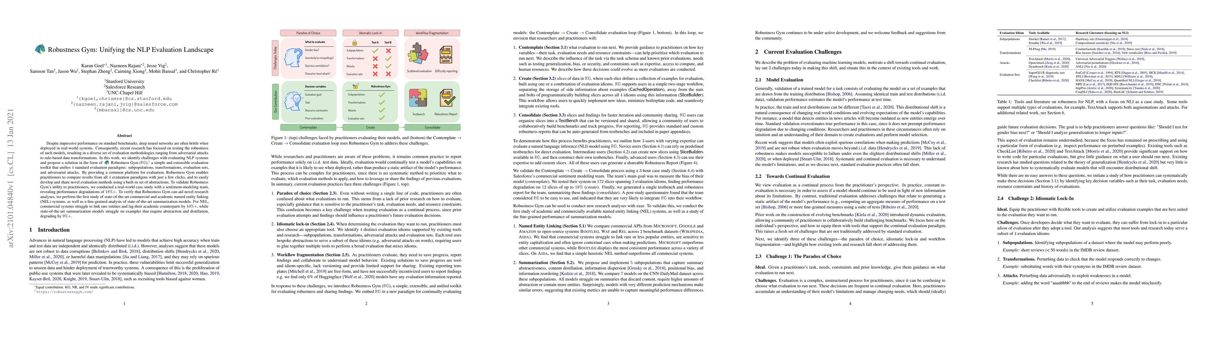 Robustness Gym is a unified toolkit for evaluating NLP models' robustness across four paradigms: subpopulations, transformations, evaluation sets, and adversarial attacks. This tool facilitates easy comparison and development of novel evaluation methods, demonstrated through case studies on sentiment modeling, named entity linking, and summarization.