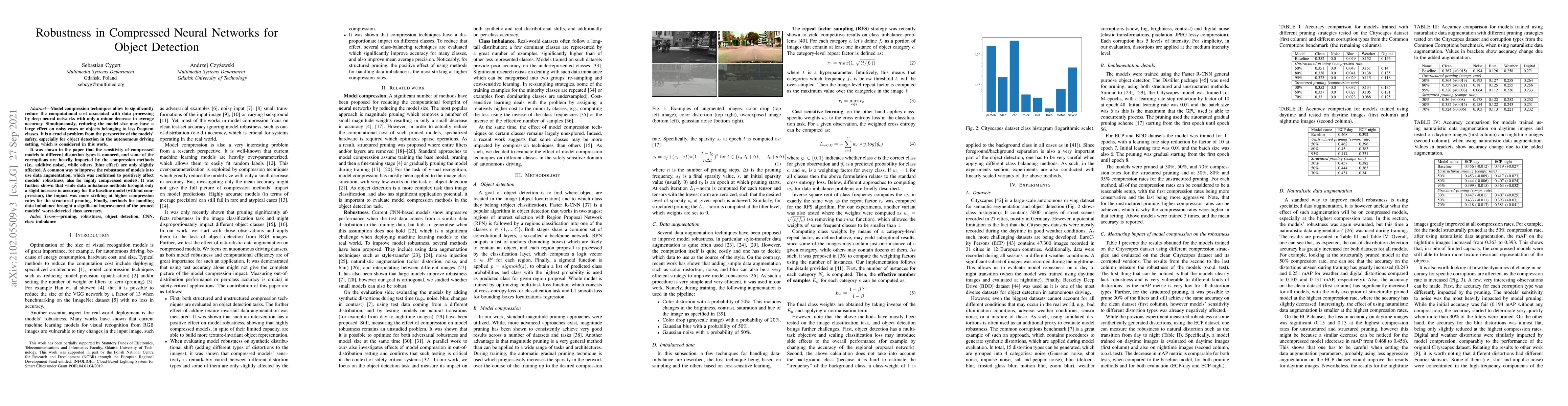 Researchers found that compressed neural networks for object detection can be improved with data augmentation and methods to handle data imbalance, leading to better robustness against noise and less frequent classes.