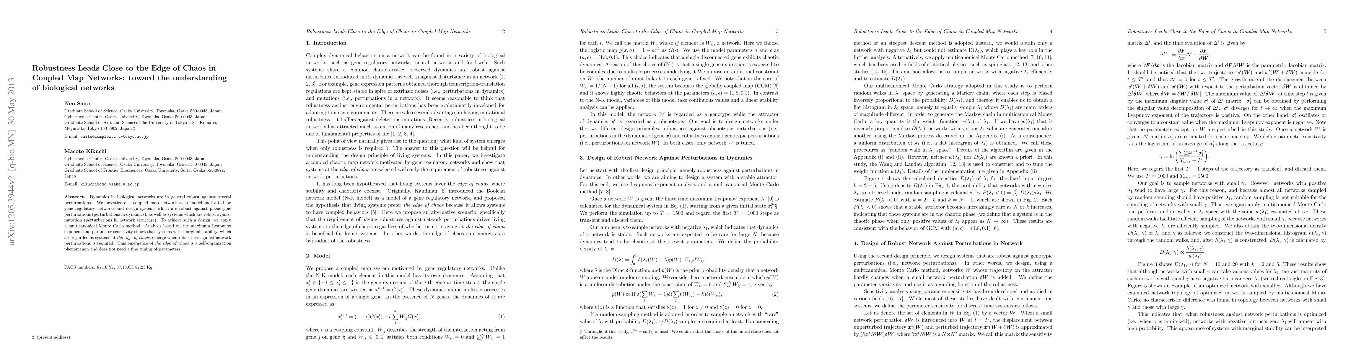 This paper explores coupled map networks as models for gene regulatory networks, demonstrating that robust systems against perturbations naturally exhibit marginal stability, often referred to as being at the edge of chaos. The study uses a multicanonical Monte Carlo method to design such systems, revealing that this robustness emerges through self-organization without the need for parameter fine-tuning.