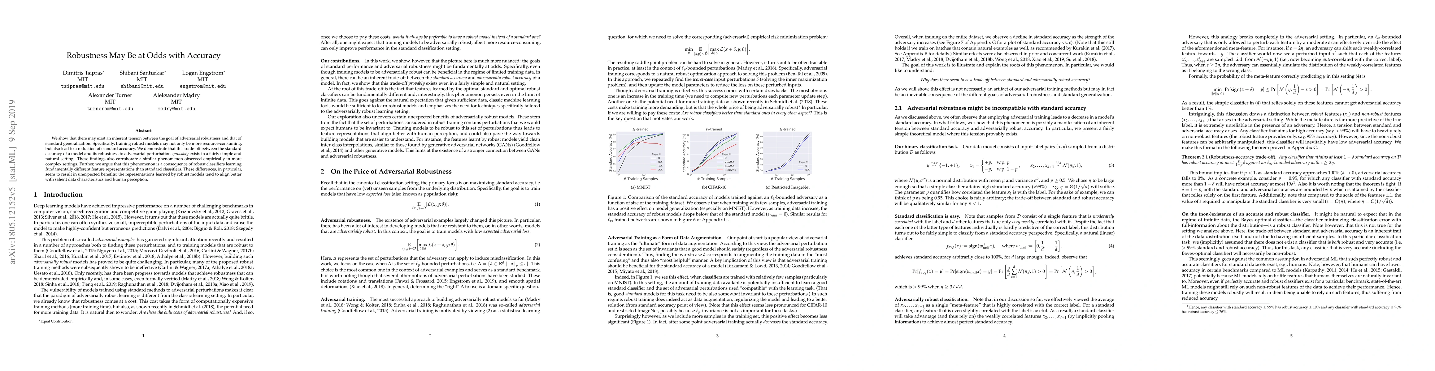 We show that there may exist an inherent tension between the goal of adversarial robustness and that of standard generalization. Specifically, training robust models may not only be more resource-consuming, but also lead to a reduction of standard accuracy. We demonstrate that this trade-off between the standard accuracy of a model and its robustness to adversarial perturbations provably exists in a fairly simple and natural setting. These findings also corroborate a similar phenomenon observed empirically in more complex settings. Further, we argue that this phenomenon is a consequence of robust classifiers learning fundamentally different feature representations than standard classifiers. These differences, in particular, seem to result in unexpected benefits: the representations learned by robust models tend to align better with salient data characteristics and human perception.