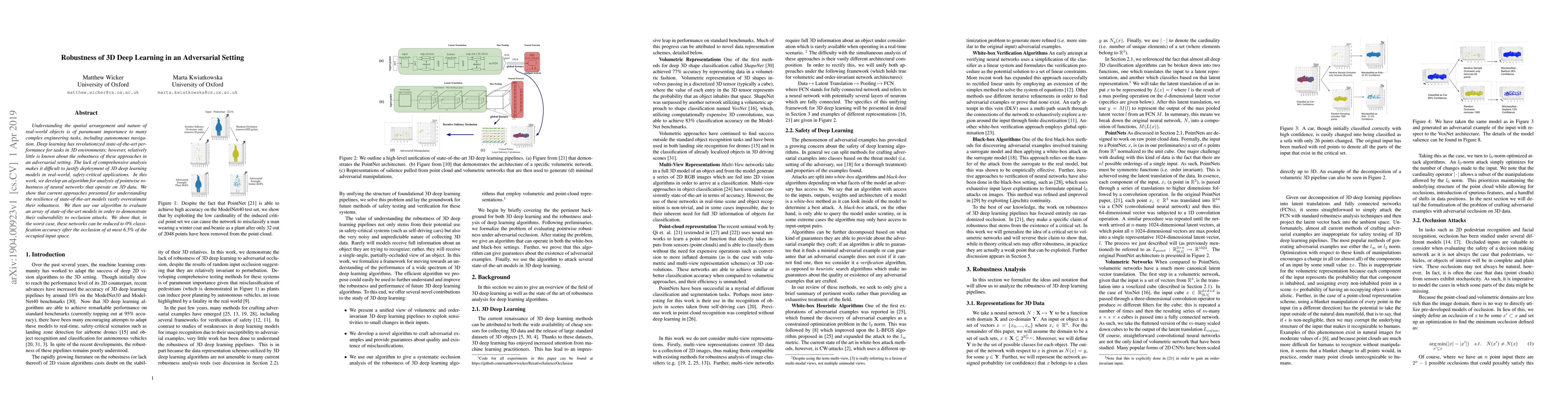 Understanding the spatial arrangement and nature of real-world objects is of paramount importance to many complex engineering tasks, including autonomous navigation. Deep learning has revolutionized state-of-the-art performance for tasks in 3D environments; however, relatively little is known about the robustness of these approaches in an adversarial setting. The lack of comprehensive analysis makes it difficult to justify deployment of 3D deep learning models in real-world, safety-critical applications. In this work, we develop an algorithm for analysis of pointwise robustness of neural networks that operate on 3D data. We show that current approaches presented for understanding the resilience of state-of-the-art models vastly overestimate their robustness. We then use our algorithm to evaluate an array of state-of-the-art models in order to demonstrate their vulnerability to occlusion attacks. We show that, in the worst case, these networks can be reduced to 0% classification accuracy after the occlusion of at most 6.5% of the occupied input space.