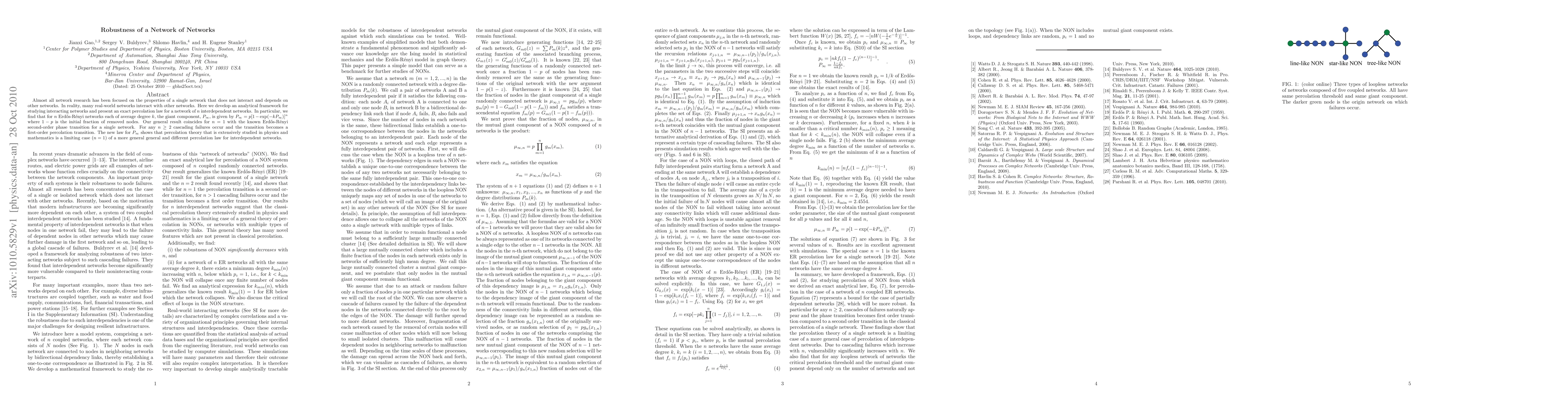 Almost all network research has been focused on the properties of a single network that does not interact and depends on other networks. In reality, many real-world networks interact with other networks. Here we develop an analytical framework for studying interacting networks and present an exact percolation law for a network of $n$ interdependent networks. In particular, we find that for $n$ Erd\H{o}s-R\'{e}nyi networks each of average degree $k$, the giant component, $P_{\infty}$, is given by $P_{\infty}=p[1-\exp(-kP_{\infty})]^n$ where $1-p$ is the initial fraction of removed nodes. Our general result coincides for $n=1$ with the known Erd\H{o}s-R\'{e}nyi second-order phase transition for a single network. For any $n \geq 2$ cascading failures occur and the transition becomes a first-order percolation transition. The new law for $P_{\infty}$ shows that percolation theory that is extensively studied in physics and mathematics is a limiting case ($n=1$) of a more general general and different percolation law for interdependent networks.