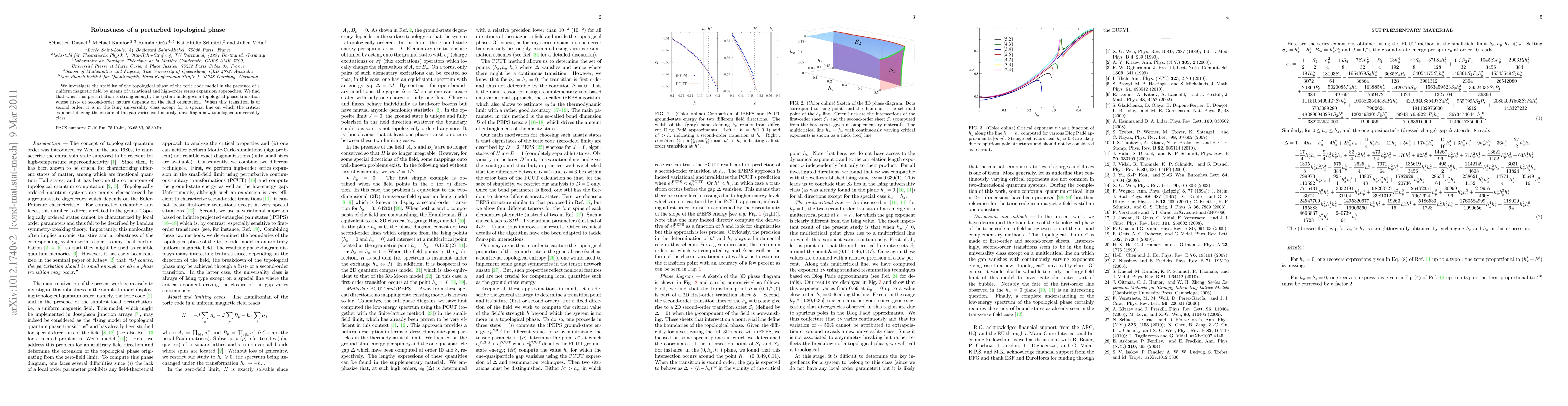 This paper investigates the stability of the topological phase in the toric code model under a uniform magnetic field, revealing that strong perturbations can induce a topological phase transition, which is either first or second-order depending on the field orientation. A second-order transition belongs to the Ising universality class, except for a special line where a new topological universality class emerges.