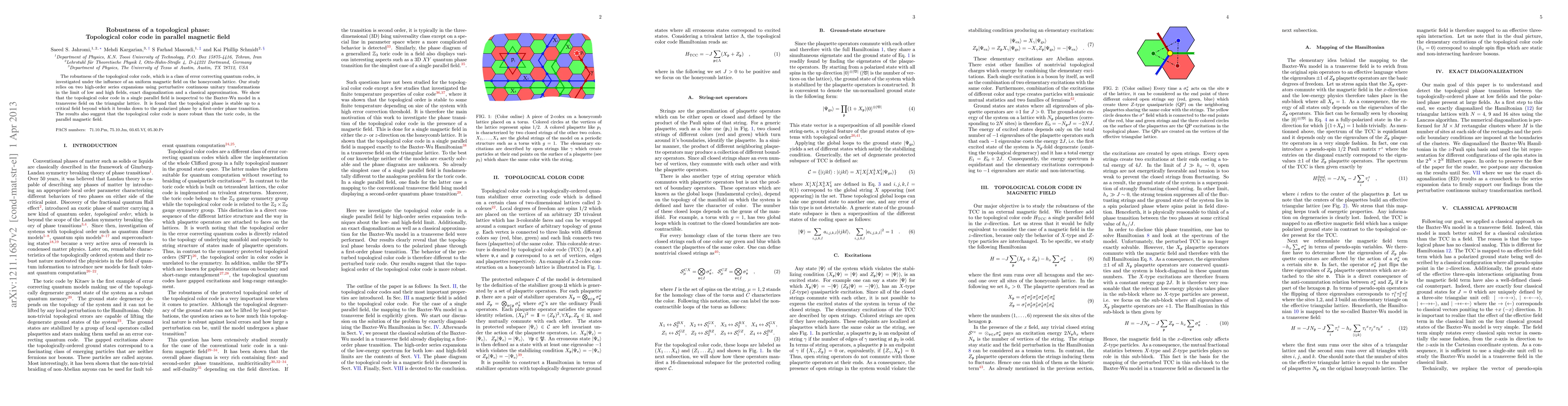 This paper investigates the robustness of topological color codes under parallel magnetic fields on a honeycomb lattice. It finds that the topological phase remains stable up to a critical field, beyond which it undergoes a first-order phase transition, and concludes that the topological color code is more robust than the toric code in such fields.
