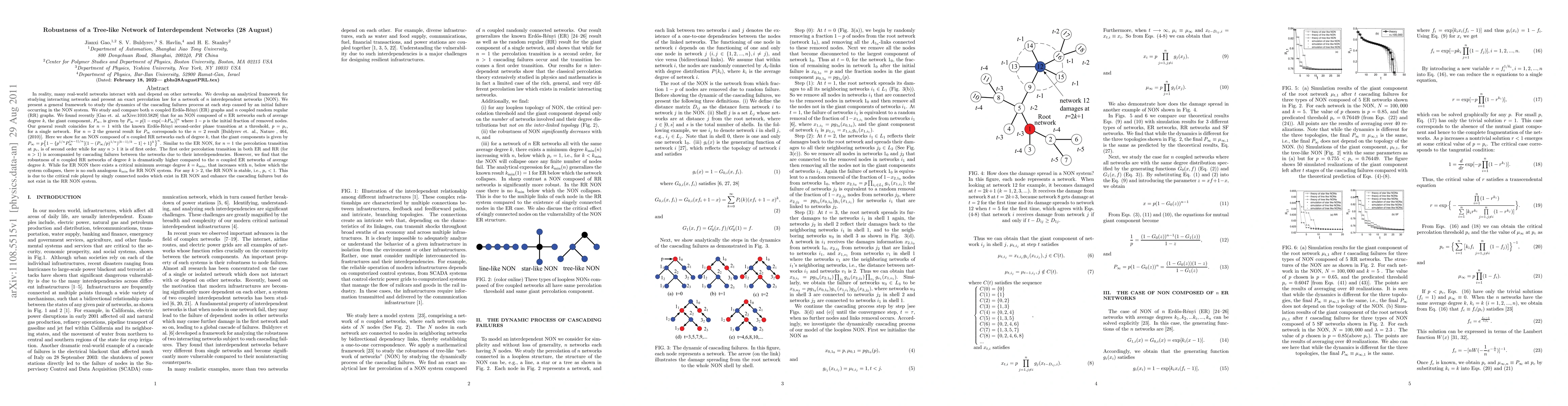 In reality, many real-world networks interact with and depend on other networks. We develop an analytical framework for studying interacting networks and present an exact percolation law for a network of $n$ interdependent networks (NON). We present a general framework to study the dynamics of the cascading failures process at each step caused by an initial failure occurring in the NON system. We study and compare both $n$ coupled Erd\H{o}s-R\'{e}nyi (ER) graphs and $n$ coupled random regular (RR) graphs. We found recently [Gao et. al. arXive:1010.5829] that for an NON composed of $n$ ER networks each of average degree $k$, the giant component, $P_{\infty}$, is given by $P_{\infty}=p[1-\exp(-kP_{\infty})]^n$ where $1-p$ is the initial fraction of removed nodes. Our general result coincides for $n=1$ with the known Erd\H{o}s-R\'{e}nyi second-order phase transition at a threshold, $p=p_c$, for a single network. For $n=2$ the general result for $P_{\infty}$ corresponds to the $n=2$ result [Buldyrev et. al., Nature, 464, (2010)]. Similar to the ER NON, for $n=1$ the percolation transition at $p_c$, is of second order while for any $n>1$ it is of first order. The first order percolation transition in both ER and RR (for $n>1$) is accompanied by cascading failures between the networks due to their interdependencies. However, we find that the robustness of $n$ coupled RR networks of degree $k$ is dramatically higher compared to the $n$ coupled ER networks of average degree $k$. While for ER NON there exists a critical minimum average degree $k=k_{\min}$, that increases with $n$, below which the system collapses, there is no such analogous $k_{\min}$ for RR NON system.