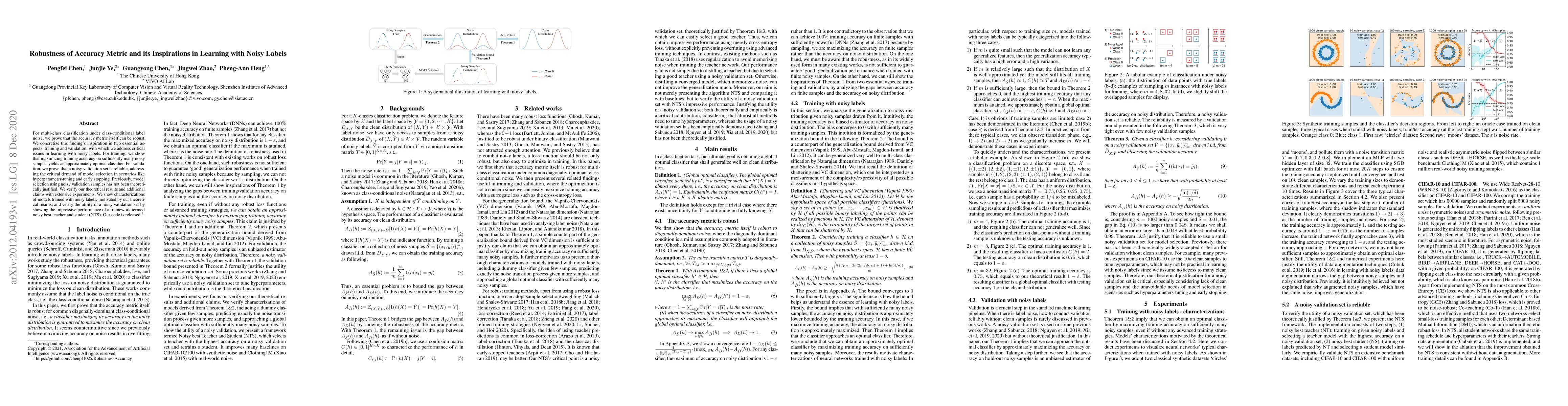 For multi-class classification under class-conditional label noise, we prove that the accuracy metric itself can be robust. We concretize this finding's inspiration in two essential aspects: training and validation, with which we address critical issues in learning with noisy labels. For training, we show that maximizing training accuracy on sufficiently many noisy samples yields an approximately optimal classifier. For validation, we prove that a noisy validation set is reliable, addressing the critical demand of model selection in scenarios like hyperparameter-tuning and early stopping. Previously, model selection using noisy validation samples has not been theoretically justified. We verify our theoretical results and additional claims with extensive experiments. We show characterizations of models trained with noisy labels, motivated by our theoretical results, and verify the utility of a noisy validation set by showing the impressive performance of a framework termed noisy best teacher and student (NTS). Our code is released.