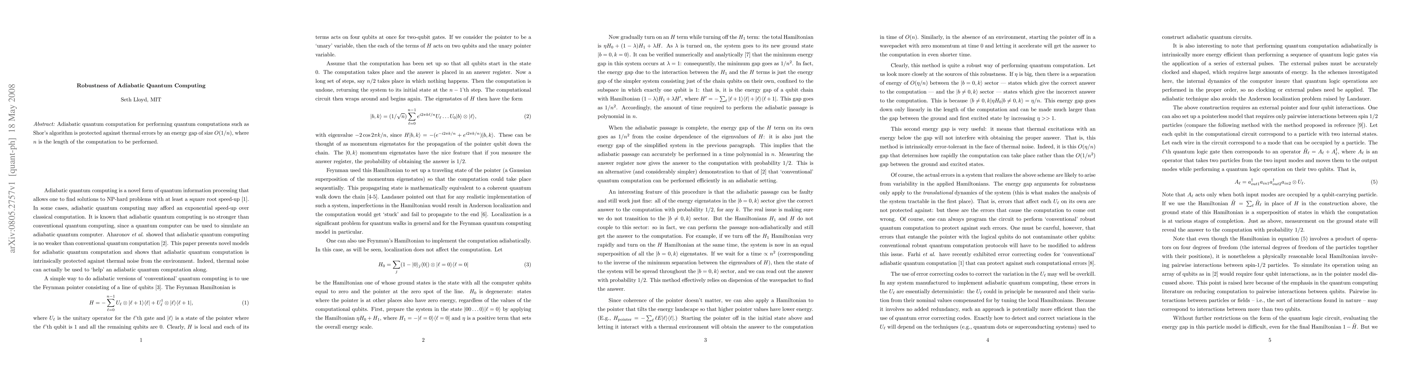 Summary: Adiabatic quantum computing maintains robustness against thermal errors through an energy gap proportional to $O(1/n)$, safeguarding computations like Shor's algorithm from disruptions as the computation length $n$ increases. This method ensures reliable quantum computation despite environmental noise.