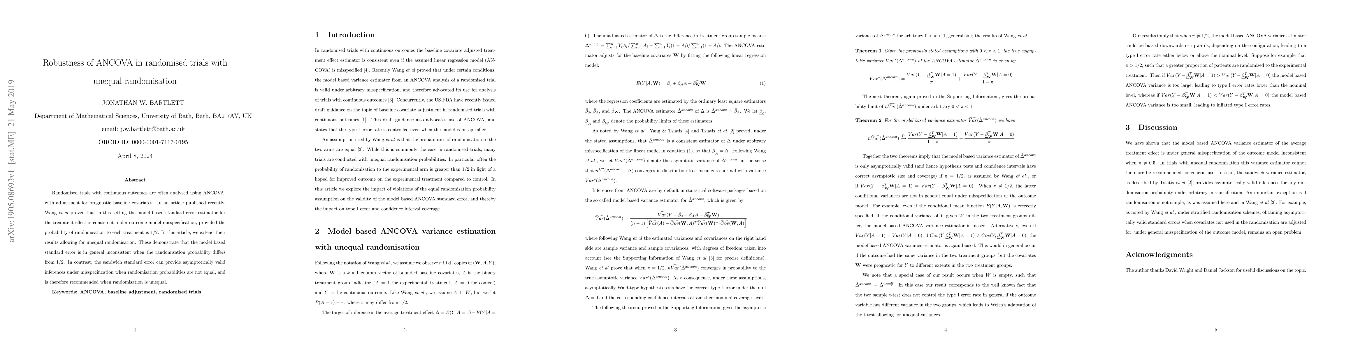 Randomised trials with continuous outcomes are often analysed using ANCOVA, with adjustment for prognostic baseline covariates. In an article published recently, Wang \etal proved that in this setting the model based standard error estimator for the treamtent effect is consistent under outcome model misspecification, provided the probability of randomisation to each treatment is 1/2. In this article, we extend their results allowing for unequal randomisation. These demonstrate that the model based standard error is in general inconsistent when the randomisation probability differs from 1/2. In contrast, the sandwich standard error can provide asymptotically valid inferences under misspecification when randomisation probabilities are not equal, and is therefore recommended when randomisation is unequal.