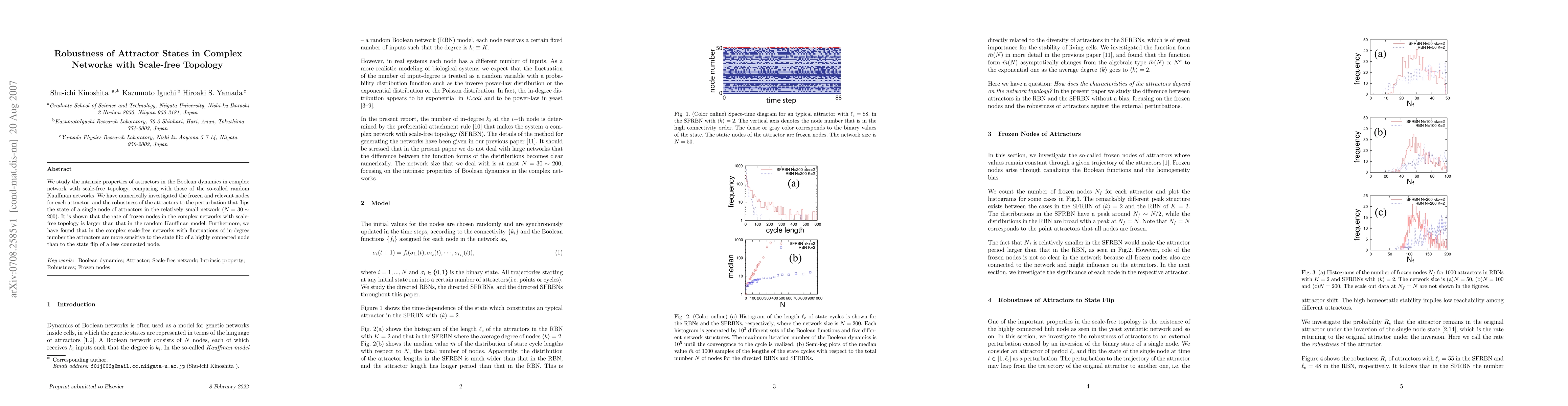 We study the intrinsic properties of attractors in the Boolean dynamics in complex network with scale-free topology, comparing with those of the so-called random Kauffman networks. We have numerically investigated the frozen and relevant nodes for each attractor, and the robustness of the attractors to the perturbation that flips the state of a single node of attractors in the relatively small network ($N=30 \sim 200$). It is shown that the rate of frozen nodes in the complex networks with scale-free topology is larger than that in the random Kauffman model. Furthermore, we have found that in the complex scale-free networks with fluctuations of in-degree number the attractors are more sensitive to the state flip of a highly connected node than to the state flip of a less connected node.