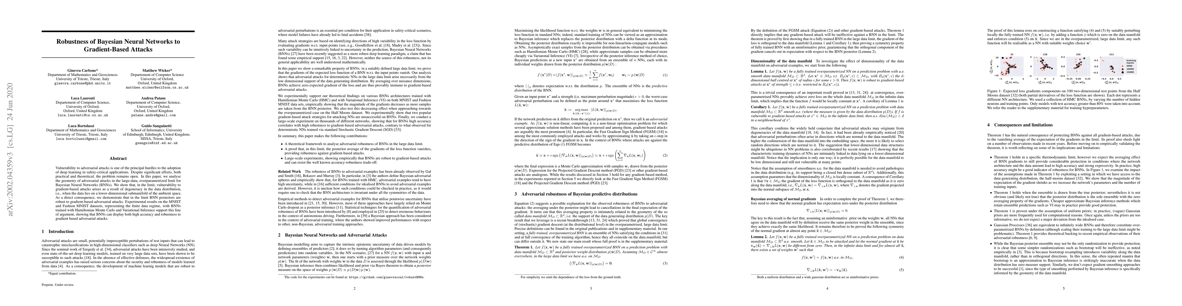 This paper investigates the robustness of Bayesian Neural Networks (BNNs) to gradient-based adversarial attacks, demonstrating that BNNs are inherently robust in the large-data limit due to the degeneracy in data distribution. Experimental results on MNIST and Fashion MNIST datasets confirm that BNNs can achieve high accuracy and maintain robustness against such attacks.