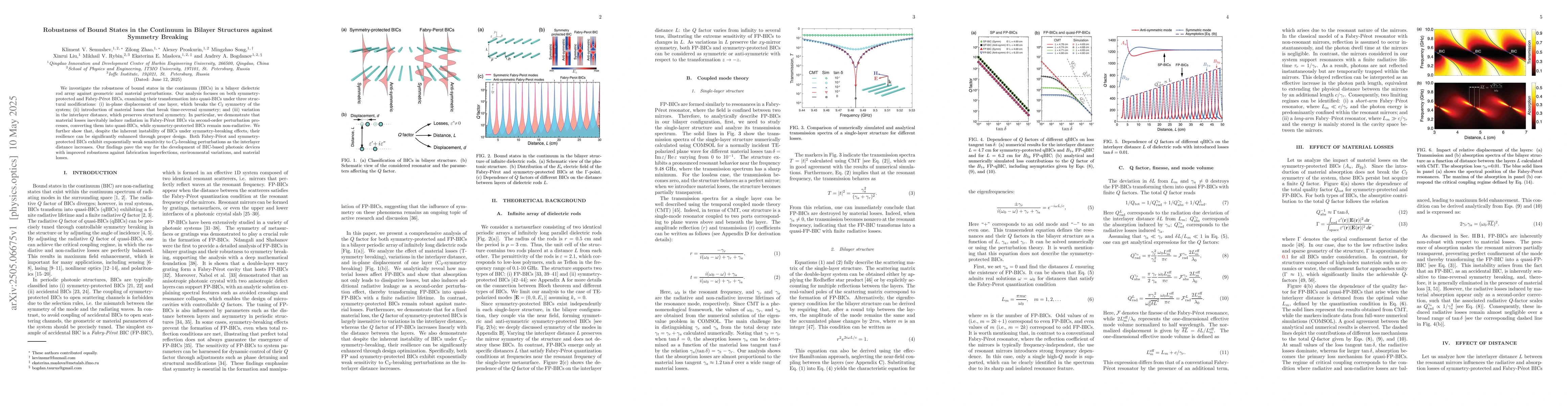 The research distinguishes itself by examining the transformation of BICs under multiple symmetry-breaking effects, highlighting the exponential sensitivity reduction with increasing interlayer distance and the contrasting behavior between symmetry-protected and Fabry-Pérot BICs.