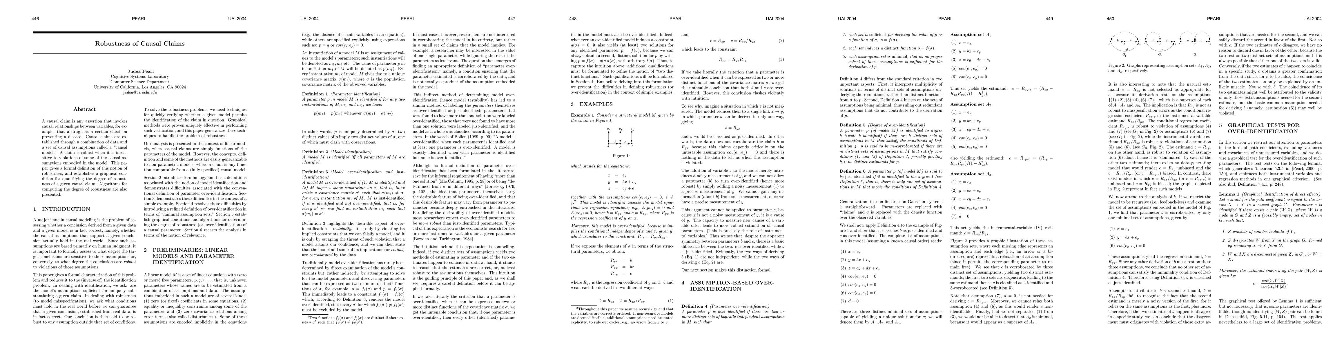 A causal claim is any assertion that invokes causal relationships between variables, for example that a drug has a certain effect on preventing a disease. Causal claims are established through a combination of data and a set of causal assumptions called a causal model. A claim is robust when it is insensitive to violations of some of the causal assumptions embodied in the model. This paper gives a formal definition of this notion of robustness and establishes a graphical condition for quantifying the degree of robustness of a given causal claim. Algorithms for computing the degree of robustness are also presented.