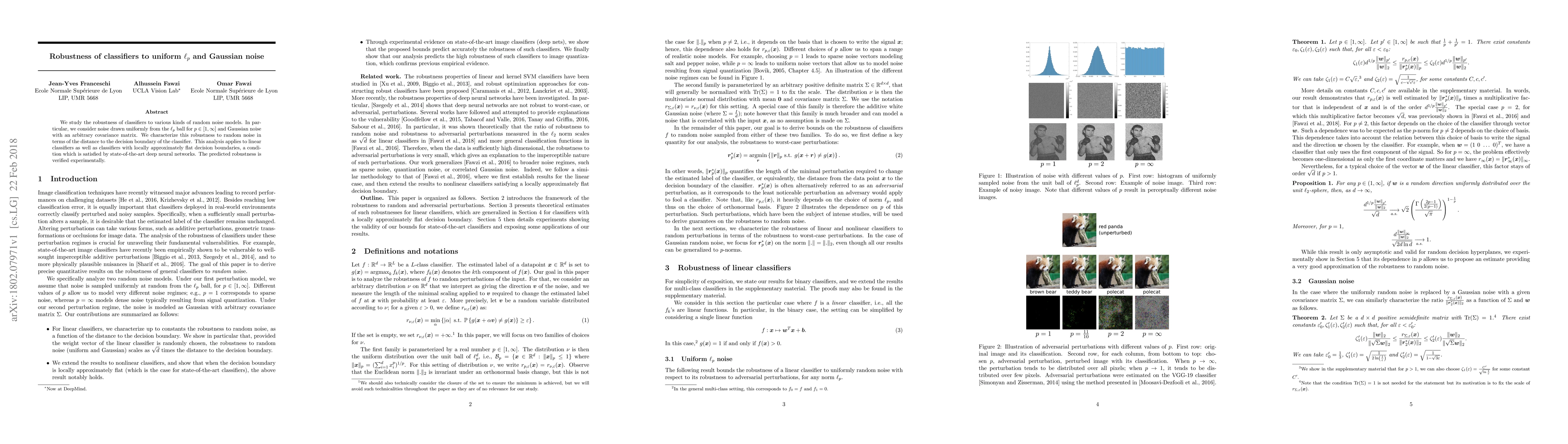 This paper investigates how classifiers, including linear models and deep neural networks, respond to $\ell_p$ and Gaussian noise, characterizing robustness based on the distance to the classifier's decision boundary. Experimental validation confirms the predicted robustness.