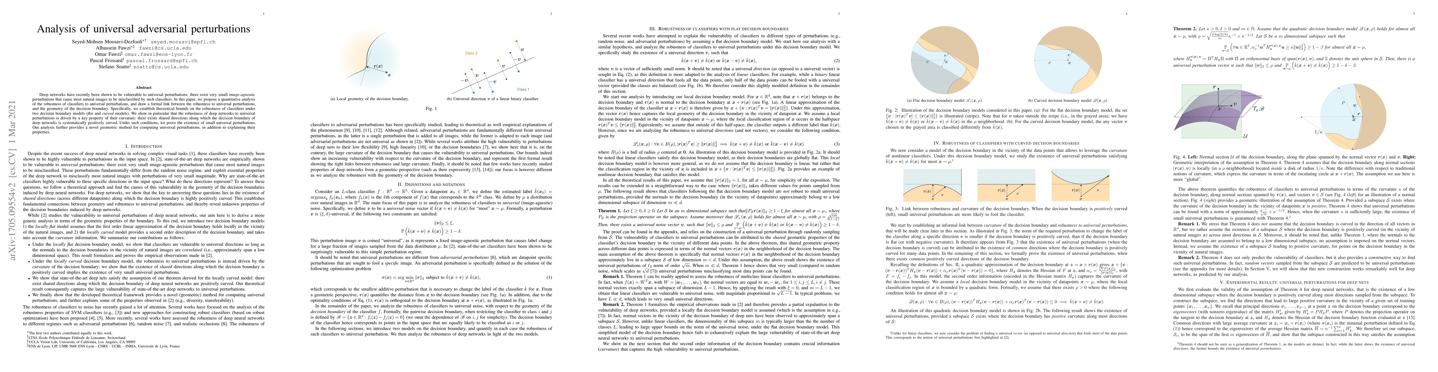 This paper quantitatively analyzes the robustness of classifiers to universal perturbations, linking it to the geometry of the decision boundary. It establishes theoretical bounds for two models and shows that shared positively curved directions in the decision boundary lead to the existence of small universal perturbations.