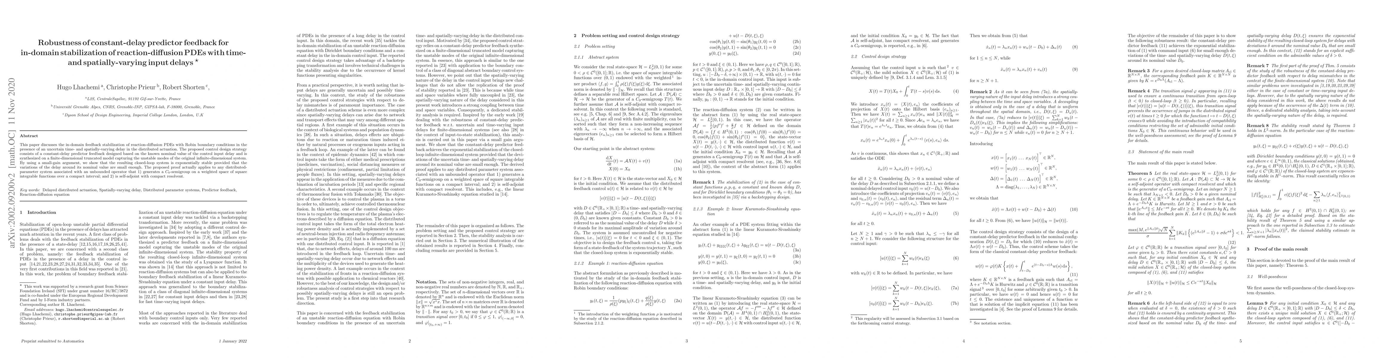 This paper proposes a constant-delay predictor feedback strategy for stabilizing reaction-diffusion PDEs with time- and spatially-varying delays, demonstrating exponential stability via a small-gain argument. The method is shown to be robust and applicable to a wide range of distributed-parameter systems.