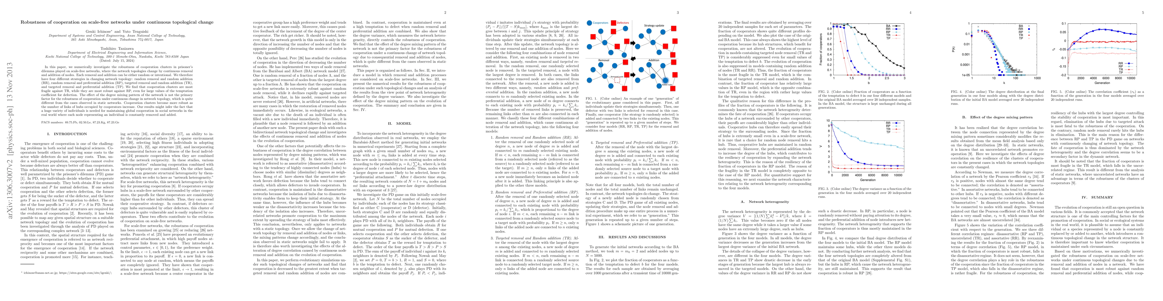 This study numerically explores how cooperation in prisoner's dilemma on scale-free networks withses under continuous topological changes, involving random or targeted node removal and addition. Cooperation clusters are found to be most fragile under targeted removal with preferential addition (TP), yet robust under random removal with preferential addition (RP), regardless of high defection temptation. The research indicates that the number of links occupied by cooperators among hubs enhances cooperation robustness, suggesting diverse individuals are crucial for sustaining global cooperation in dynamic social networks.