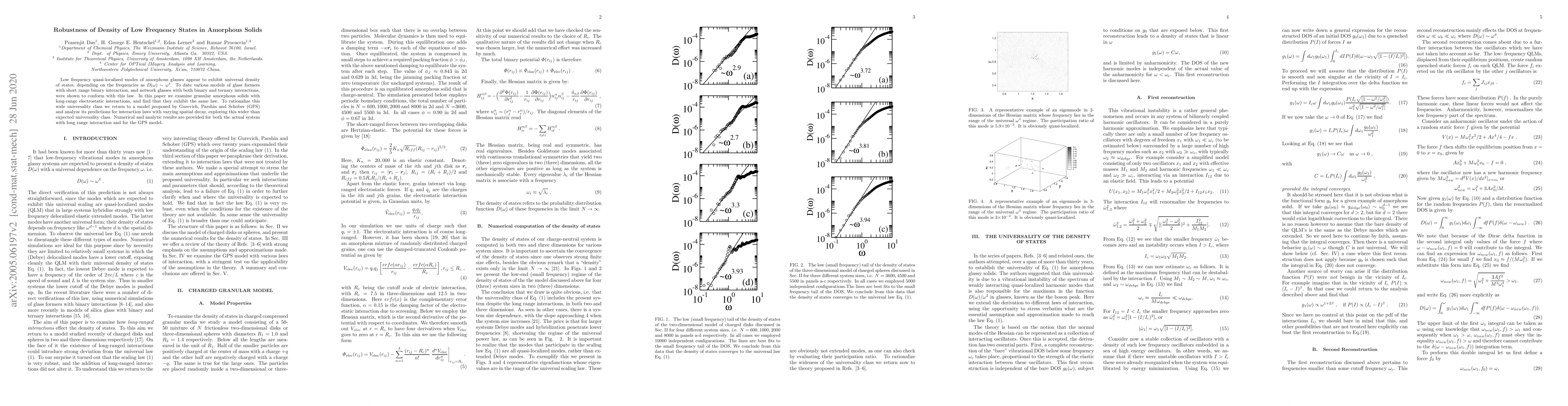 This paper investigates the robustness of the universal density of low frequency states in amorphous solids, finding that granular materials with long-range electrostatic interactions conform to the same $D(\omega) \sim \omega^4$ law as previously observed in short-range interacting glasses. The study rationalizes this broad universality through an analysis of the GPS model, providing both numerical and analytic insights.